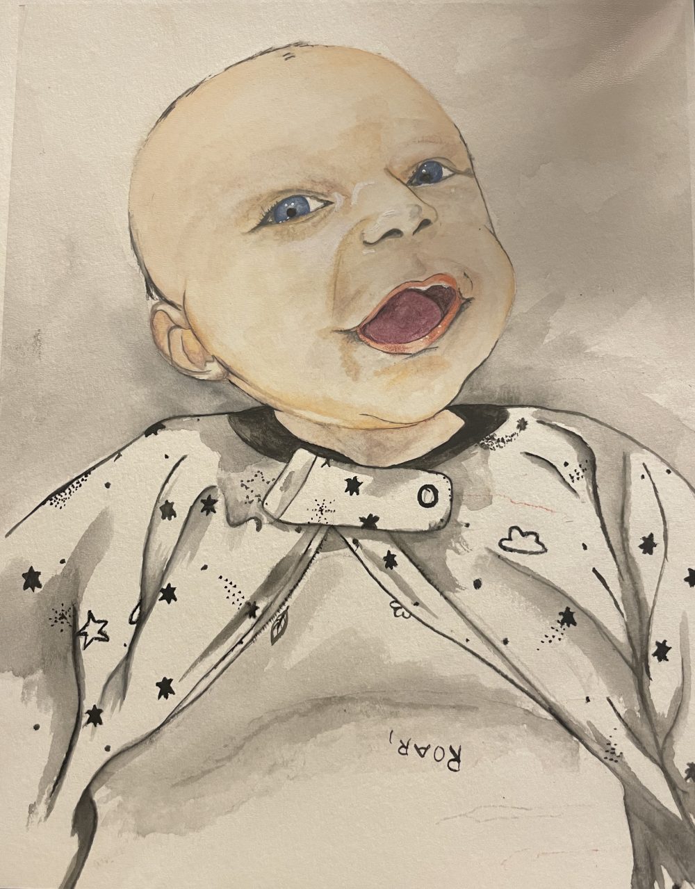 This was one of my options for an art assignment, we had an assignment to draw the 3 steps of a drawing. The rough sketch, the solid lines, and then the final with shading or color. This was one of my ideas that I branched off of and finalized with watercolor. I was self-conscious about this piece but decided to try and finish it later that day. It is my baby nephew's portrait.