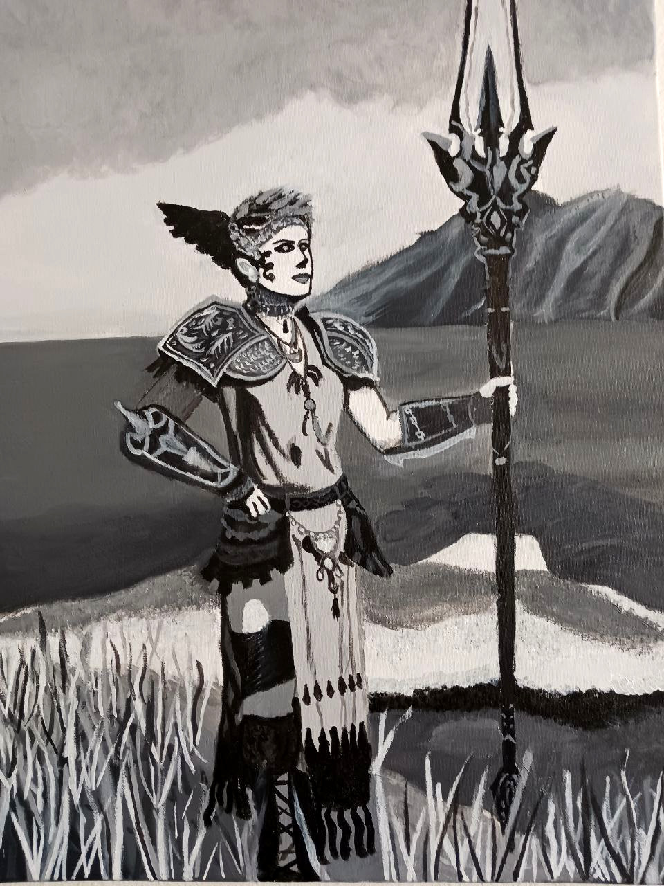 This was for my Black and White Assignment in my painting class. It was my first time using acrylics and using a sizeable canvas. The purpose of this painting was to replicate our source image as much as possible. Considering the picture I used came from a video game, getting as much detail in there as possible was my main focus as well as recognizing all the different values that pulled this piece together.