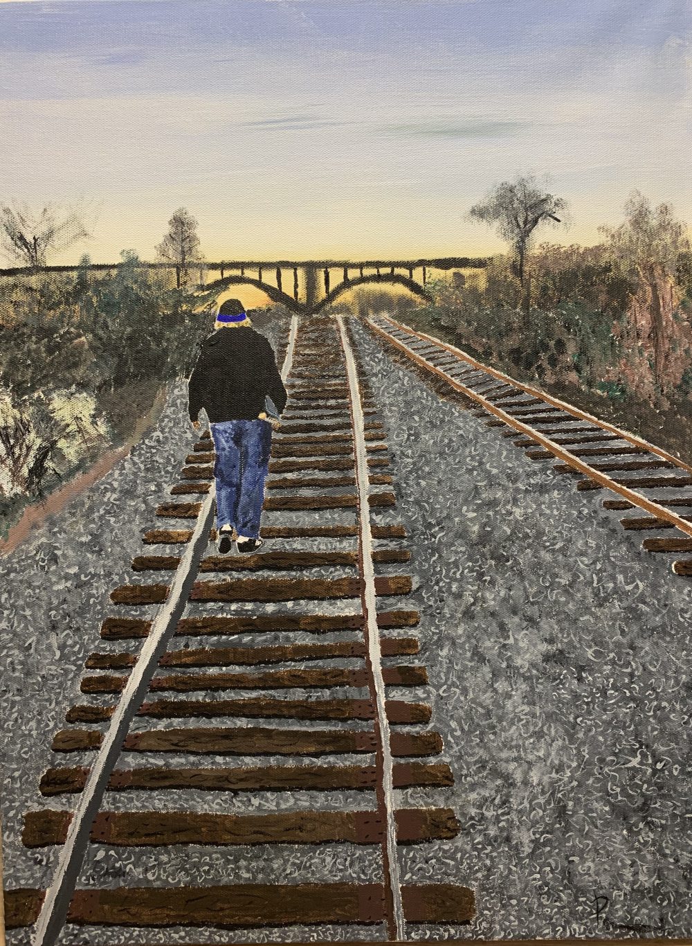 This was my first painting on a canvas and it was supposed to represent a pattern with function. I chose the train tracks with my friend walking on them. I used acrylic paint. We were walking to a DIY skatepark tucked off the river next to the train tracks.
