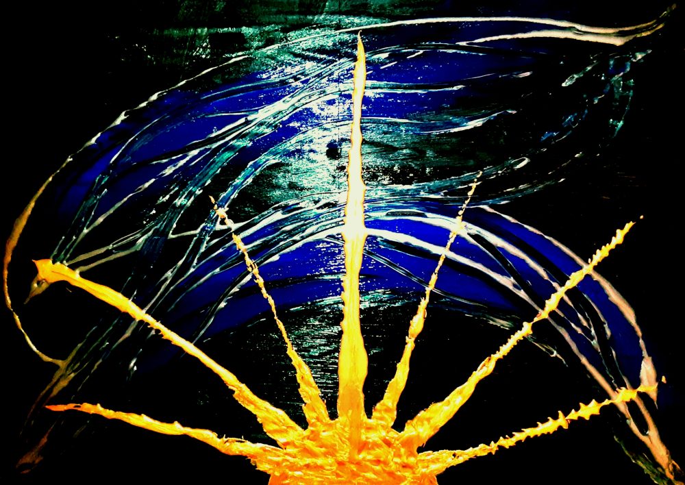Acrylic pouring, mixed metallics, mixed media (with up-cycled paper form).
