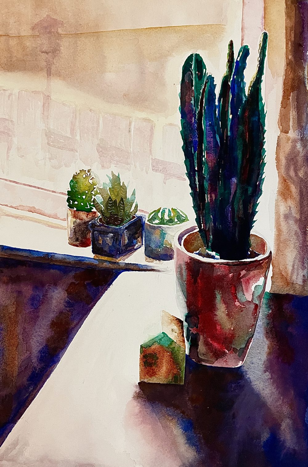 This assignment was to do a still life, working from real life, that captured very dramatic lighting. I challenged myself to both work with the nature of the watercolor as it enjoys flowing and layering, as well as incorporating linear forms and crisp edges without the use of masking. It was a slow exploration.