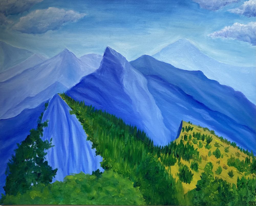 This oil painting was made for the class project Atmospheric Perspective. For this paining we tried to capture the depth through the use of color. I first mapped out the general idea of what I wanted, then added layers of different colors in the attempt to add depth and detail. At first I was trying to make it very realistic but then I let myself have fun making the mountains with loose movements. Making it in my opinion fun and expressive.