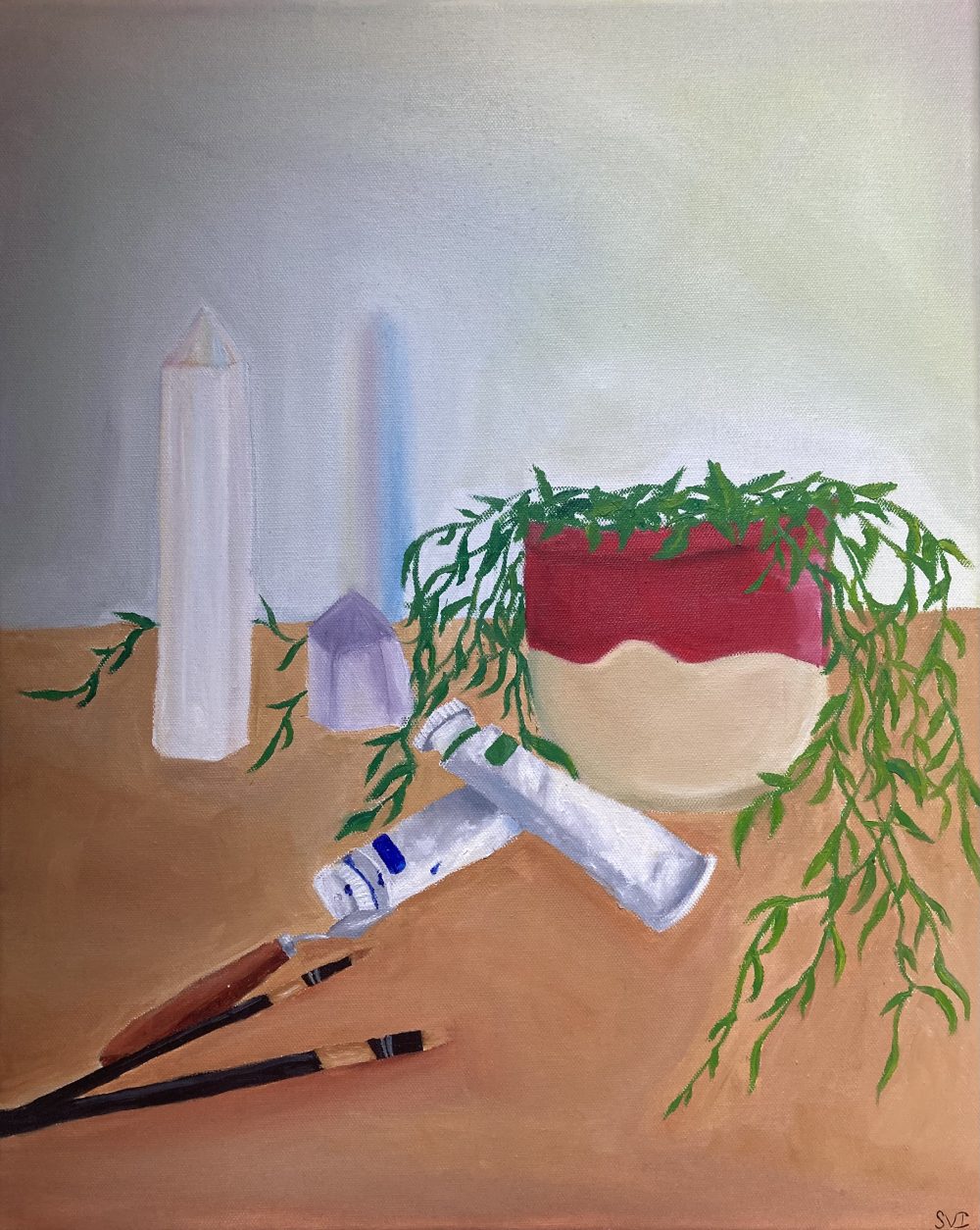This paining was for the Sill Life assignment. This was my first time using oil so there was a lot of trial and error in this painting. When deciding what I wanted to have in my still life I wanted to pick things that challenged me a little and looked cute and cohesive together. The light shining through the clear quartz prism was the extra challenge and detail I was excited to try out.