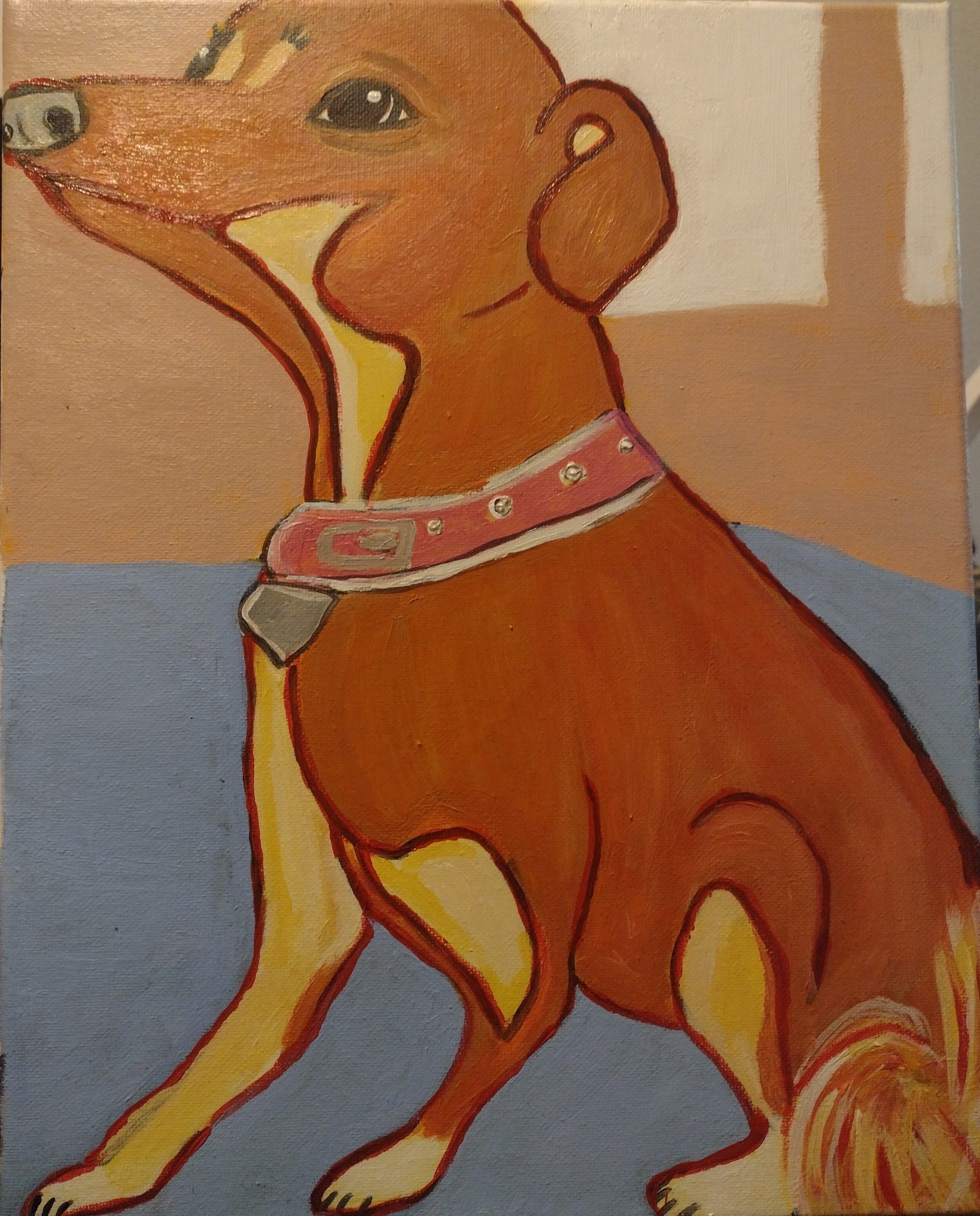 I experience how to take a picture and sketch it on a canvas; how to use the right colors for the background and how to position the image. I used charcoal to sketch and acrylic to paint. This image is of a small dog, and a distant background. Having the dog take most of the canvas space, declares he is in charge of the house.