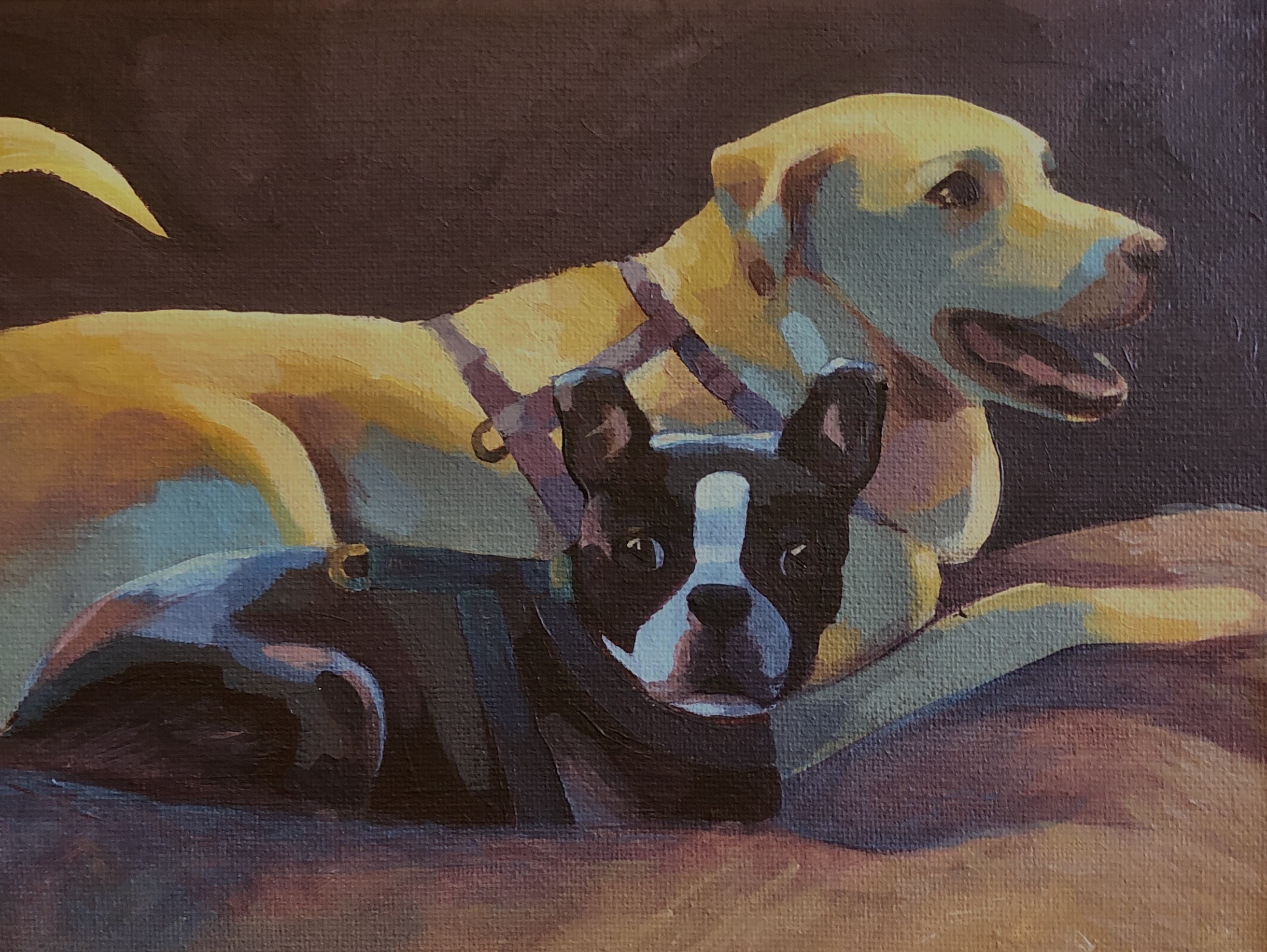 This is a painting in which I was tasked to paint animals on a large scale. I decided to paint my two dogs, Rex and Barney. I wanted to paint a dignified picture of my dogs because I wanted to honor them while they are still in my life. I put them close together to show their affectionate bond as adopted brothers. I chose to incorporate a wide variety of hues to express my artistic style and to capture their characters visually.