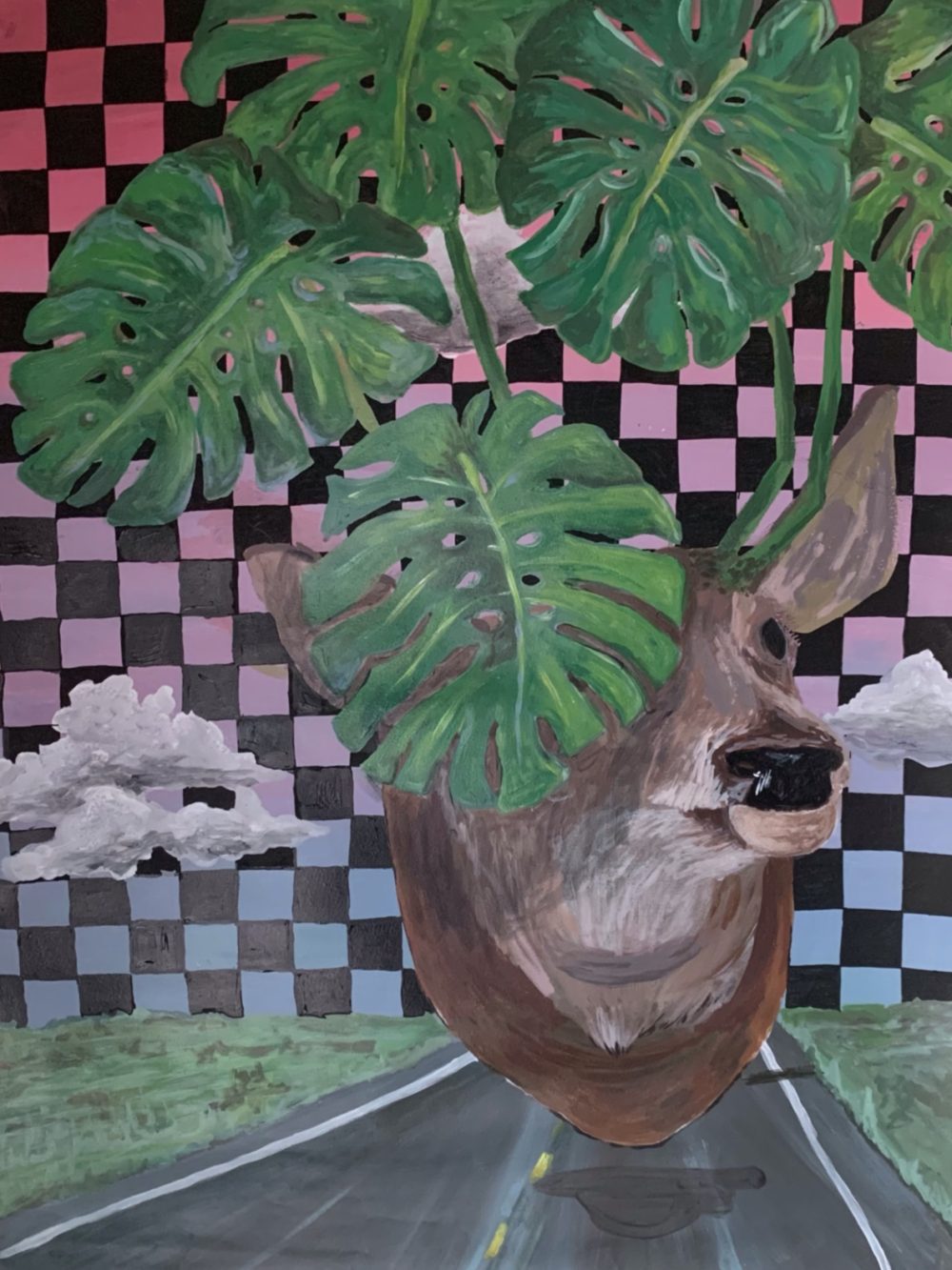 This project was a collage assignment we could create from magazine clippings or digitally. I made my original image on Procreate abandon then used that image as reference to make the final painting. I knew I wanted to paint a taxidermy deer mount, so that’s where I started. In the process what came to be a floating dear over a highway, perhaps in a place you’d expect to see a deer alive, but instead it’s mounted as a trophy. Monstera leaves growing where antlers should be represent further life.