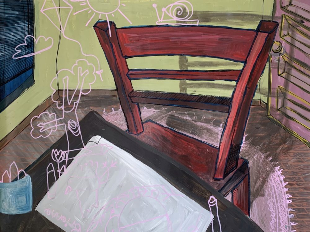 This painting is a recreation of my childhood drawings I found at my grandmothers house. She’s held on to most of the drawings I had made for her over the years. This shows how a person's skill level can change.