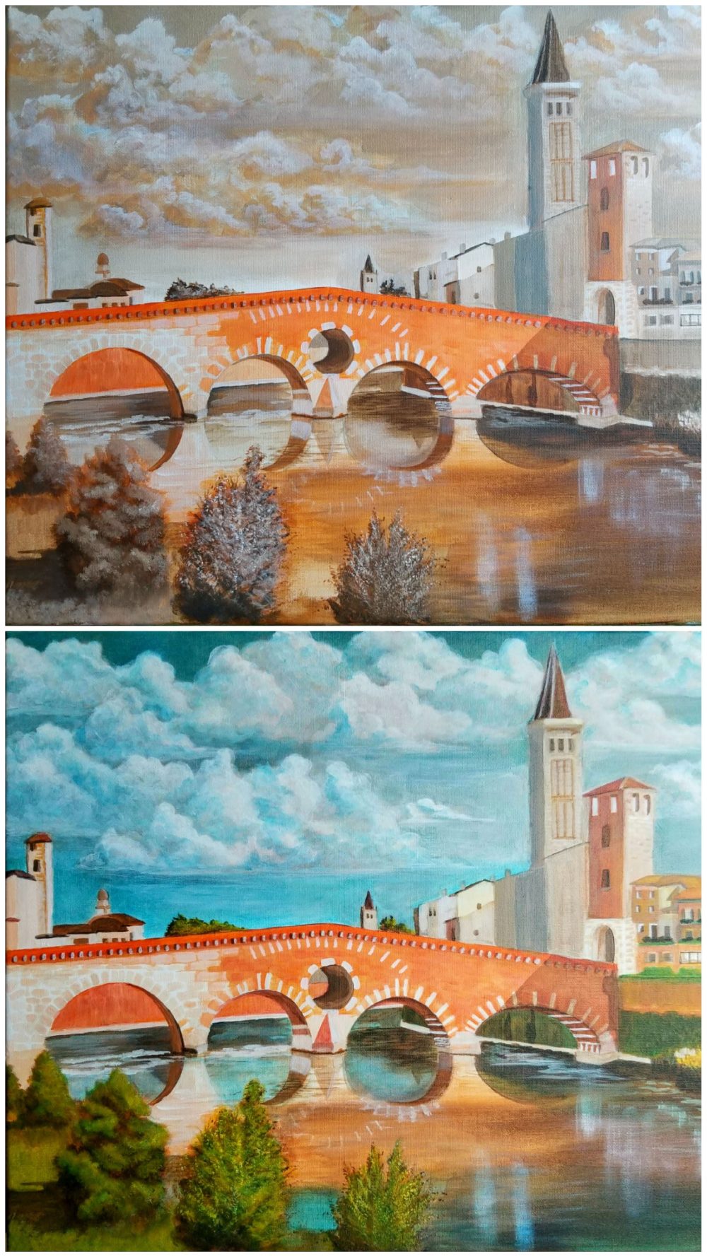 This was an exercise in glazing. I started with a limited pallet of just Ultramarine Blue, Cadmium Orange and Titanium White. Then shifted the mood of the painting by glazing with their complements to add color vibration.