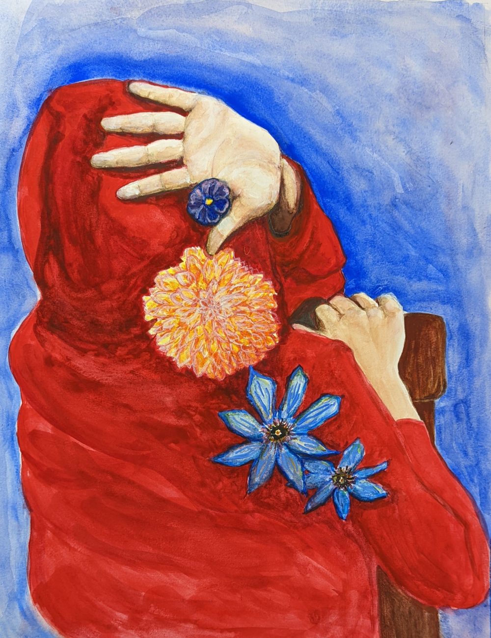 A watercolor exploring the symbolic strength of body gesture in refusing interaction in the time of COVID.
