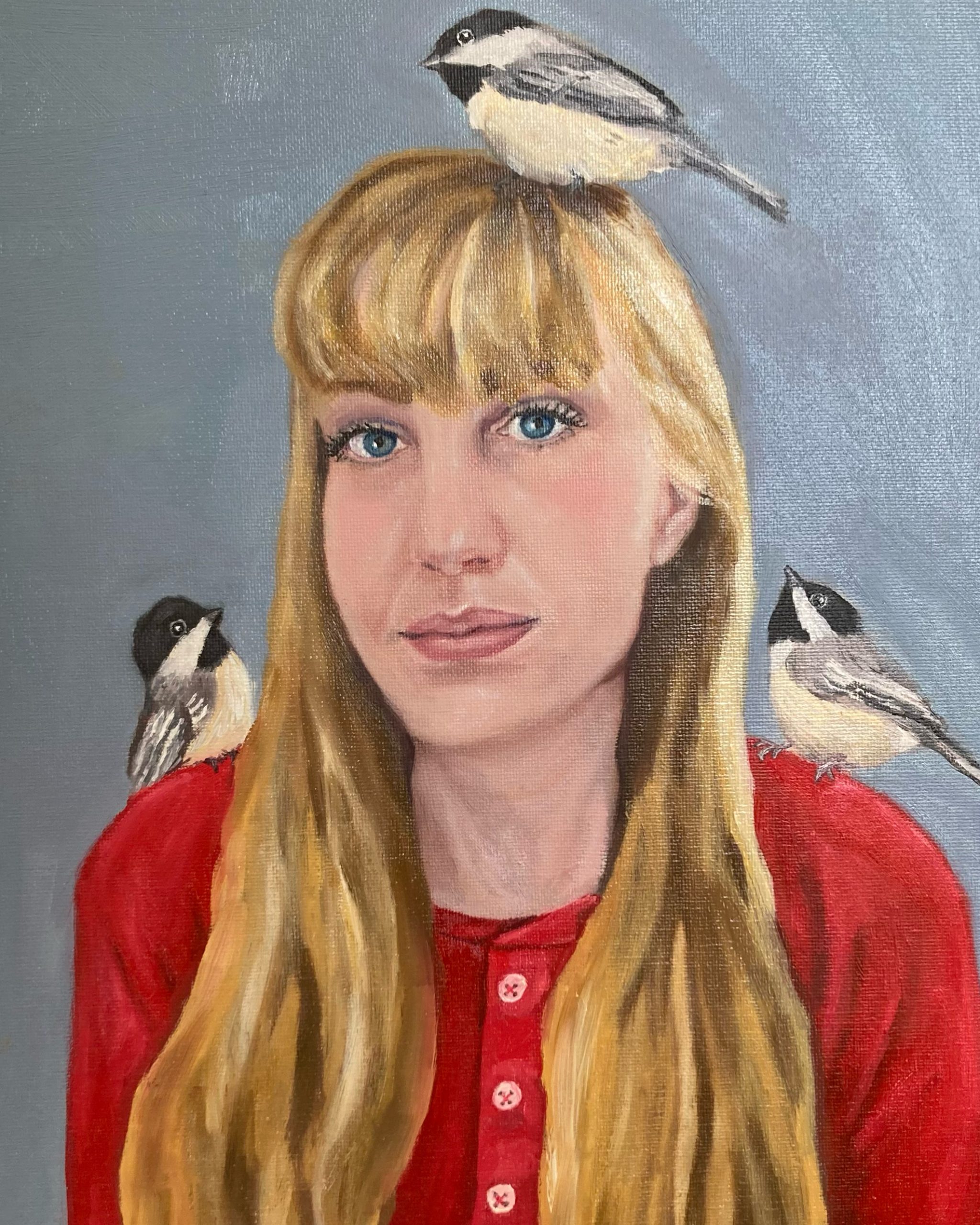 This painting is a self portrait inspired by the view I have of my bird feeder from my bedroom window. The chickadees surrounding me convey the sense of passive observation that I have frequently felt during the pandemic. Especially spending so much time indoors, watching my window. The world is active around me but I remain a little separate from it. Connecting with nature has helped me feel reengaged with the world again.
