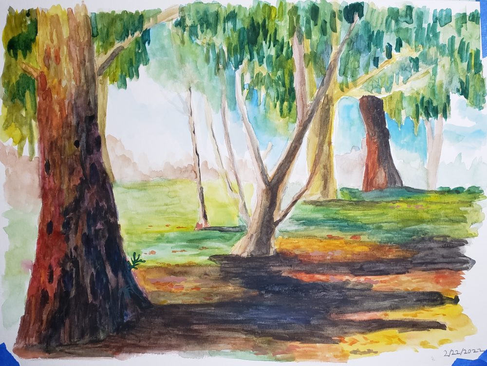 I did a lot of sketches and things of a landscape of a park that I live across. Because of the easy access I kept coming back and experimenting by painting the same view. This was the final piece that I turned in for my watercolor class.