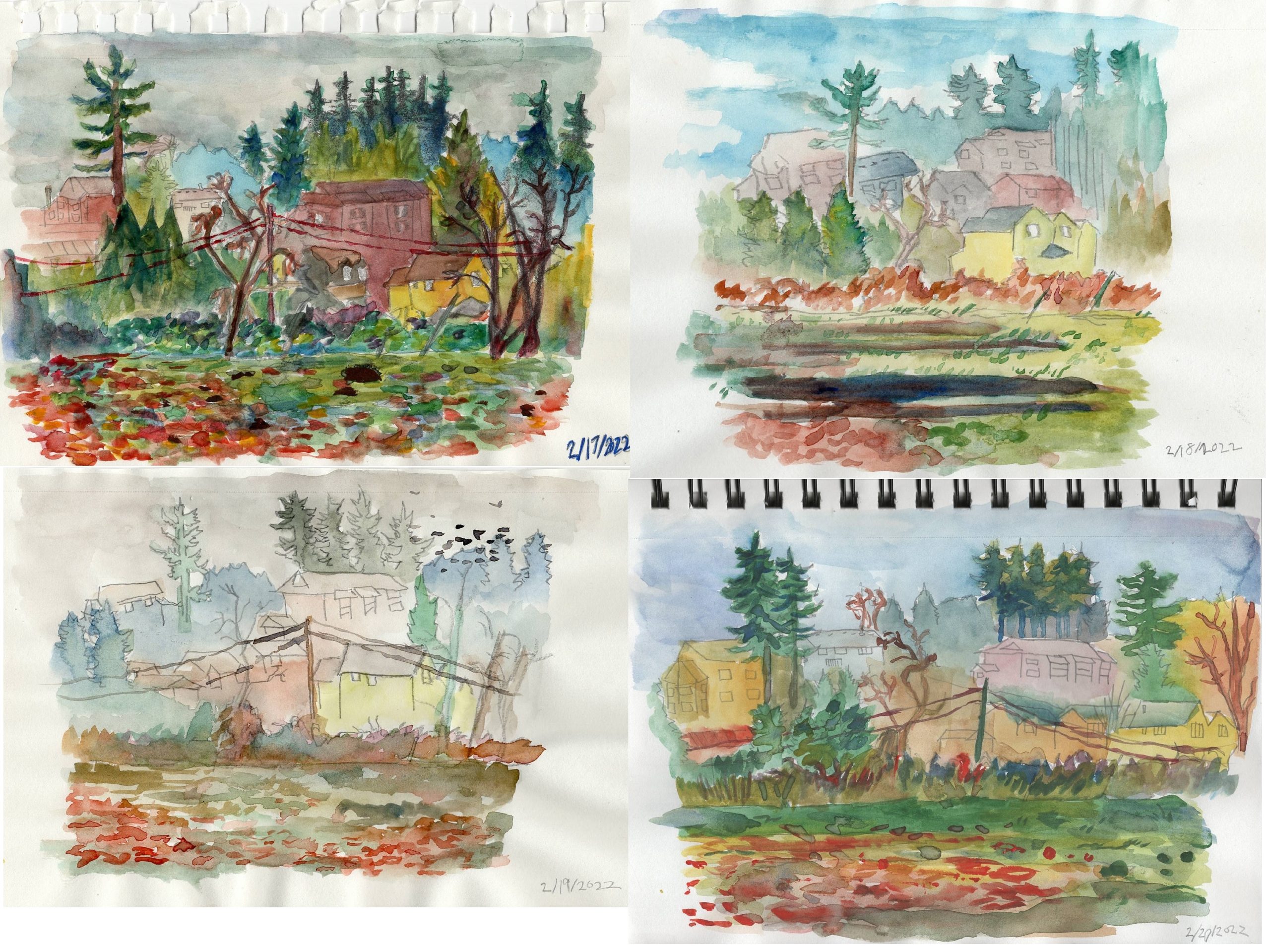I was orginally just going to make a thumbnail sketch of a view that I wanted to make a final painting out of. But I disliked my first drawing and decided to come back the next day. The weather was so different though, that I thought it might be interesting to just try to paint the same view for a week. I only lasted 4 days though (it was really cold.) These are from my sketchbook and taped together in a long format. Here I have it in a simpler viewing.