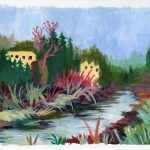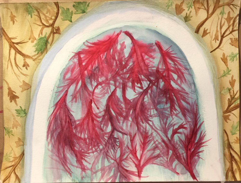 I walked around the neighborhood gathering Japanese maple leaves that had fallen. I then took them home and filled my clawfoot bath tub in the back yard. While soaking with the maple leaves in the hottub I used the water from the tub with my watercolors to create the painting. The image relates to how lovely and playful life can be while creating art and how we and watercolor are one in a romance of water selves.