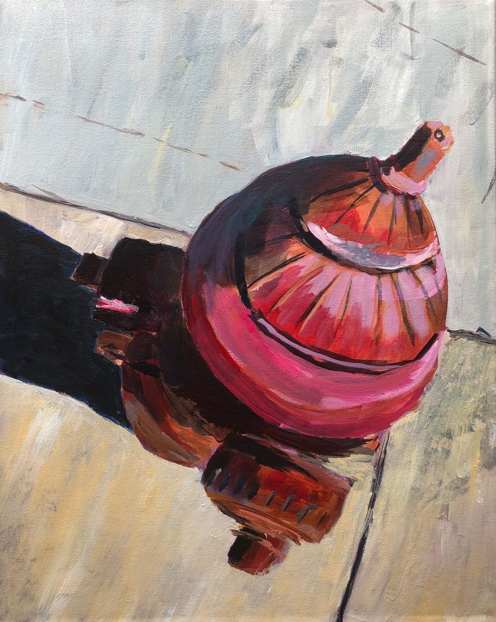 Study of a hydrant, an object we may see every day and not notice. I tried to capture the rich texture and color of the weathering and the still bright colors in a dull urban landscape. The initial lay-in was fast, but I worked on many varying layers to capture this richness.