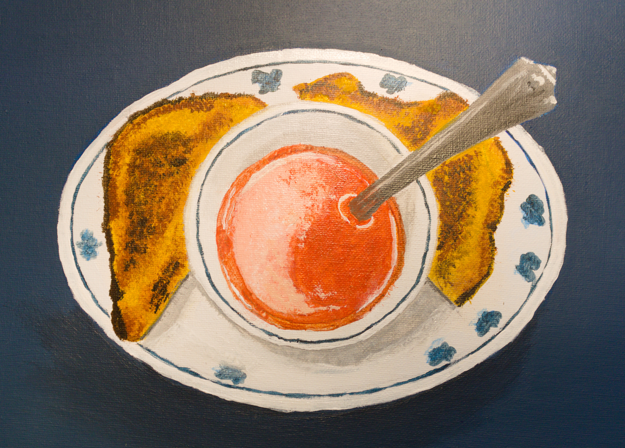 This was a class assignment to paint a flat, two-dimensional still life of objects seen from above. I chose a stock photo of a small bowl of tomato soup and a grilled cheese sandwich I shot years ago as my subject. I wanted it to be simple, blatant and familiar, but still contain extremes of color and temperature - warm, bright food and cold setting.