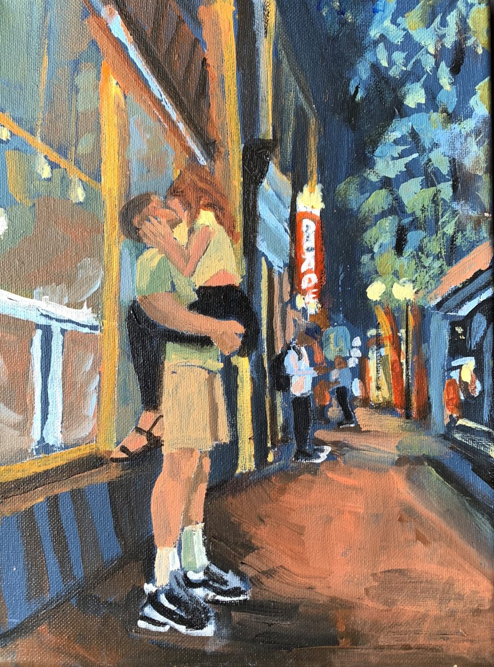 Our assignment was to make a night painting creating a believable world where a story is unfolding. My painting is based on a photo of a young man and woman taken at night in downtown Portland. In this time of Covid fear and isolation, this young couple continues to connect with friends, our city, and each other. I wanted to show everything in the painting connected by color.