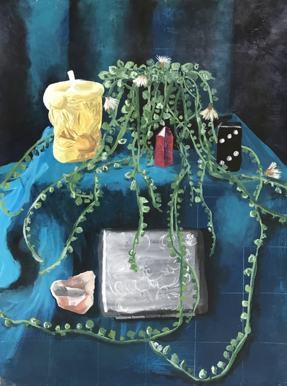 This piece is 18 x 24” acrylic on paper. A still life with a deeper message of personal and spiritual growth. The past two years have forced us as a society, and myself personally, to reflect on what really matters. To force change where we aren’t aligned with who we want to be. As the pandemic took over, I felt coerced into reviewing my relationship to work, to my community, and to my values. I was critically forced to grow. This piece is an altar dedicated to that process.