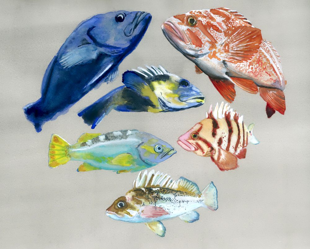 This project focused on menageries on toned paper that we created for ourselves using ink. I focused on different types of rockfish that you can find at the Oregon Coast Aquarium.