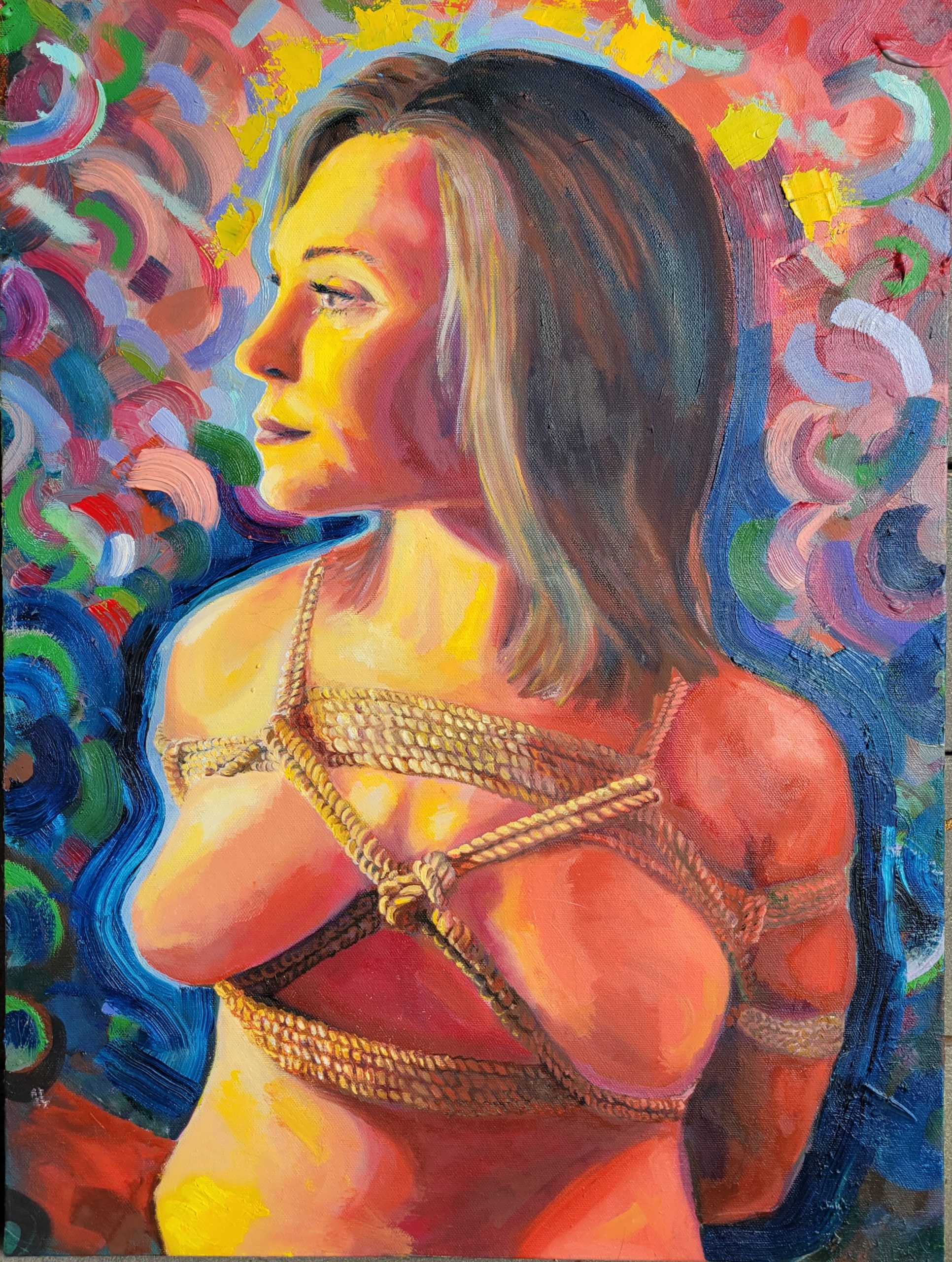 In this piece, I attempted my largest portrait painting done to date. Using oils in bright colors, I rendered a portrait of a friend of mine who modeled rope ties in a personal photography shoot. Mixing an abstract background with intense colored lighting and shading to create a striking image related to female sexuality.