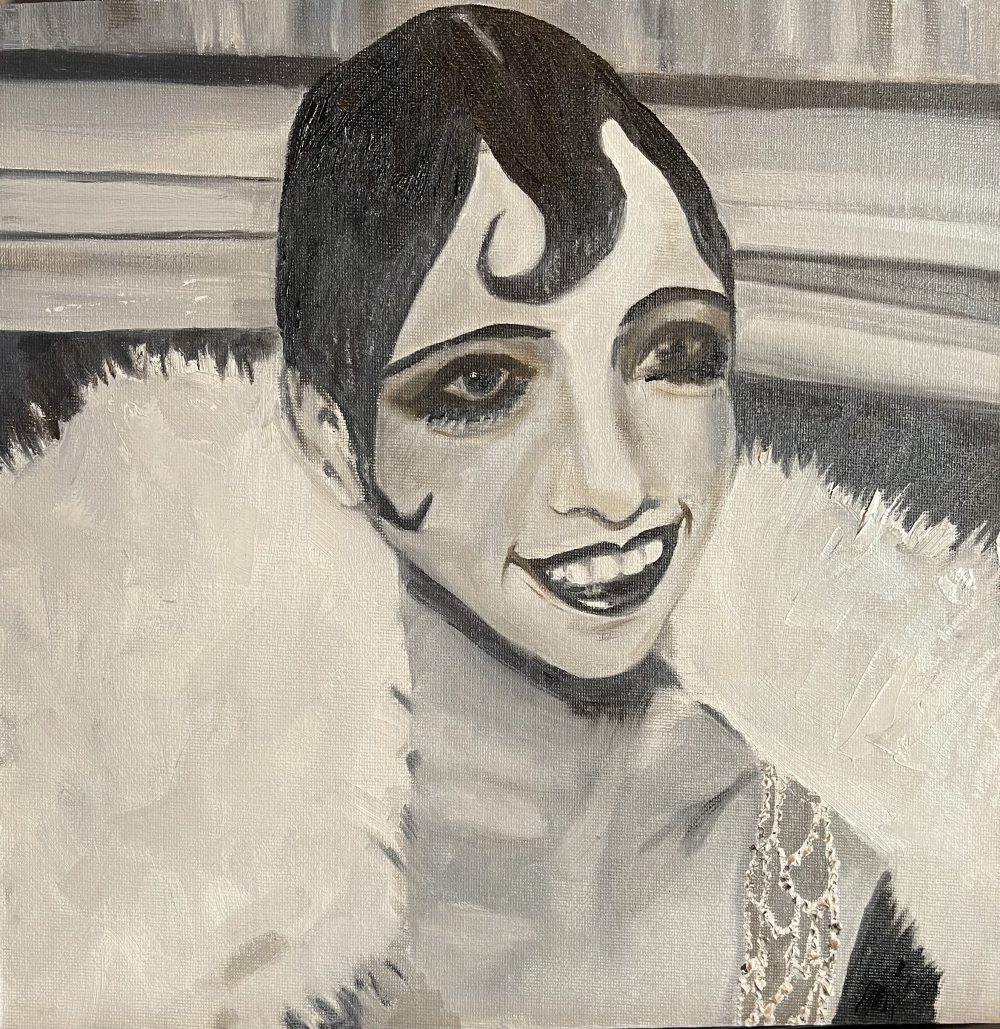 I used mainly greyscale in oil for this painting. I painted from an original black and white photo taken of Josephine Baker. I experimented with brush strokes and other instruments to paint the fur and the eyes.