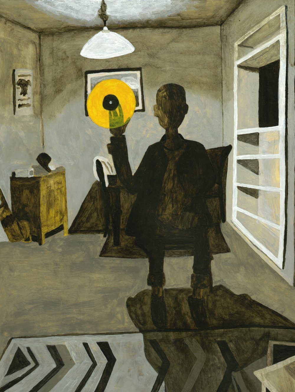 This painting is a study of light values using black, white, and a single color. The centerpiece of the painting is the vinyl record, glowing bright yellow like the sun shining and giving life, which is intended to reflect the importance and reverence I have when engaging in auditory forms of art.
