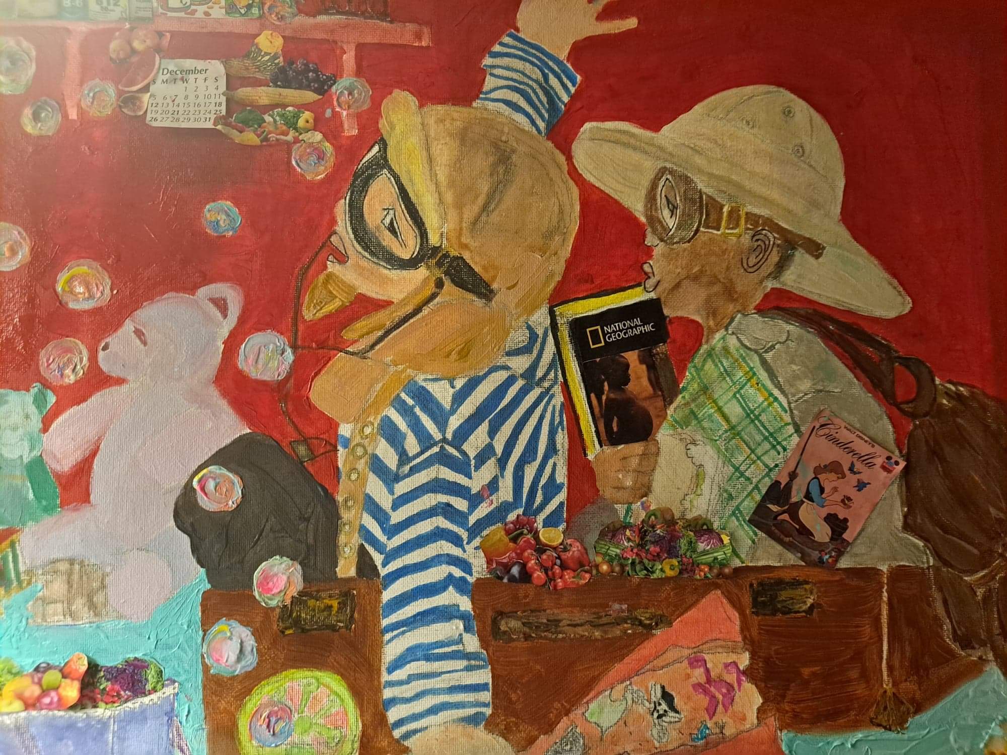 I wanted a pungent red in the background because blood is red. I was going for opal for the bubbles, so that's why I used nail polish. I wanted a safari jungle expedition pilot look so I used watercolor and oil paints.
