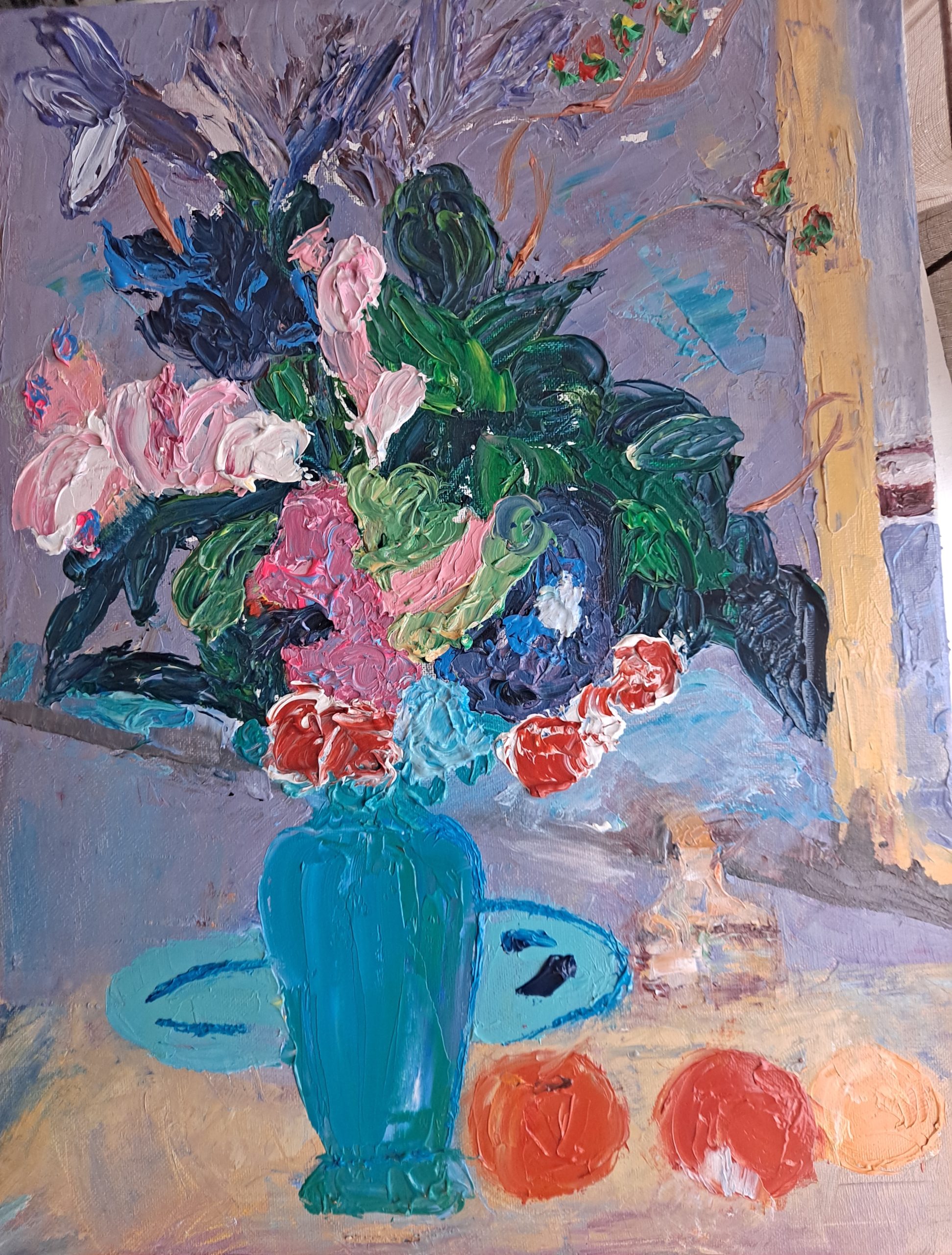 I did my best to keep the feel that Cezanne created in the original, but, due to circumstances, I gave it a twist. I actually enjoy the flamingo pinks; I love the color periwinkle and tropical jungle flowers. It was fun to choose different colors. I stayed locked up for hours, nervous, trying to do an exact replica, but when I let it become what it is, I lacked the colors. I was so worried to present this piece in purples rather than blues. But I feel happy with the change and that I made it as best I could.