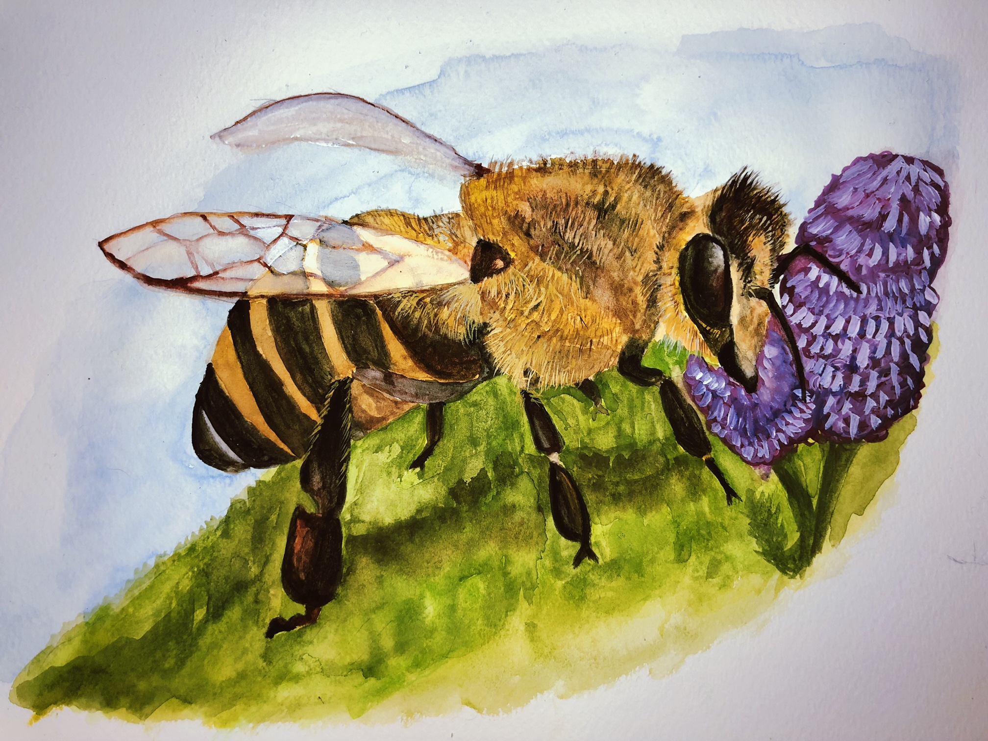 While this painting had no particular focus in terms of technique, I wanted to create a visceral experience for the viewer. In doing so I utilized different sizes of brushes and different techniques such as removing pigment and adding water to create a lighter effect. I wanted to really bring out the texture and give the viewer a feeling of being up close to a honey bee.