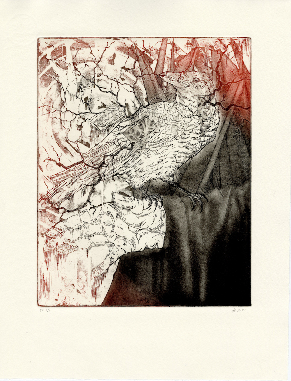 In this project I experimented with incorporating methods of etching that were new to me, such as soft ground, using tusche wash as a resist for aquatint, and printing À la poupée (with multiple colors on one plate.) The different visual elements in the print explore the mythological symbolism of the labyrinth, and the relationship between biology and our growing architectural and industrial environment.