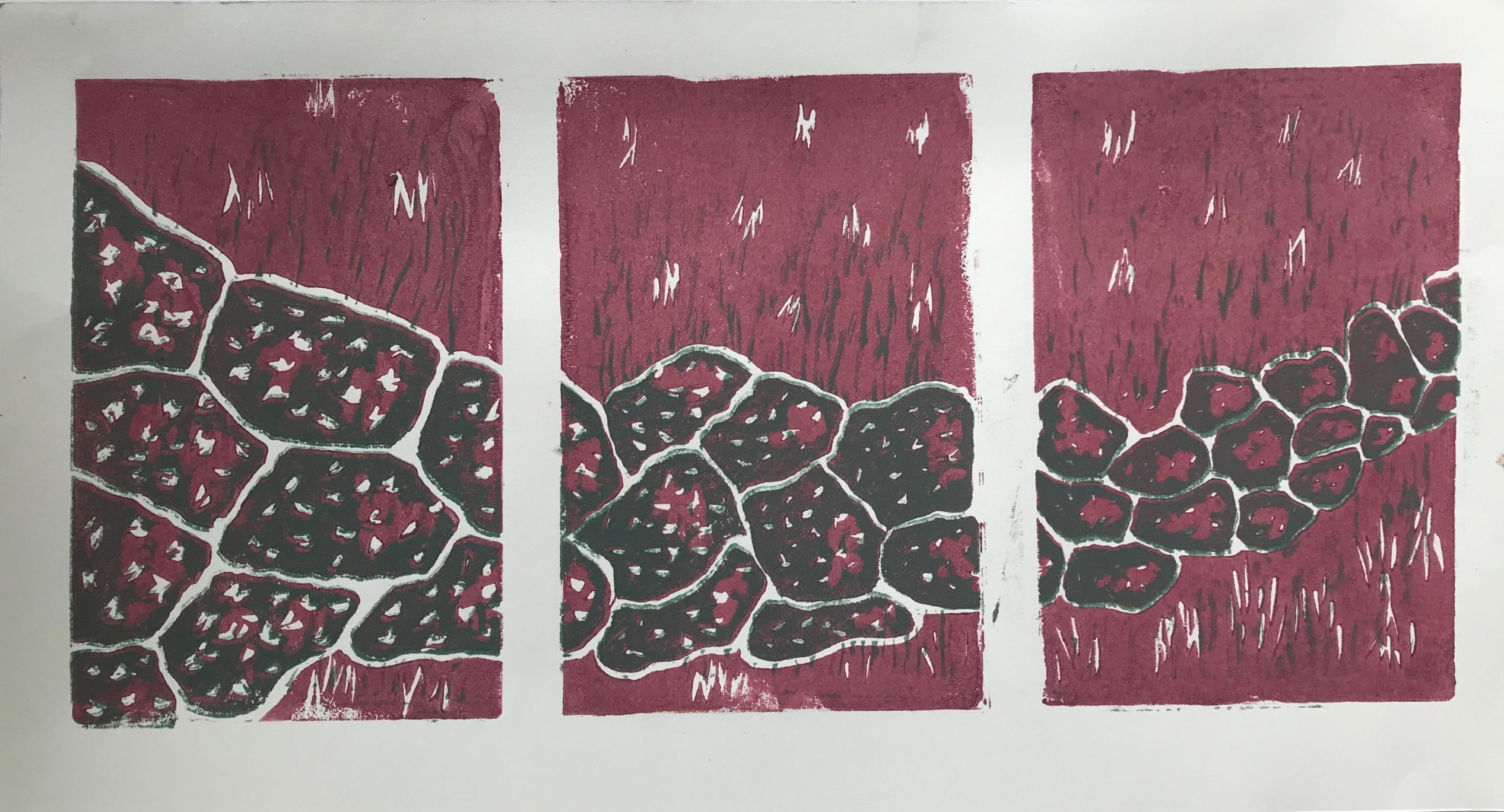 Lichen-encrusted stone walls are a theme I have explored in many media. They remind me of summers growing up, with just enough structure to contain expansive possibilities. I enjoyed the technical challenge of registration for this triptych. When pushed to experiment with color, I was surprised that the least obvious combination resulted in the strongest work.