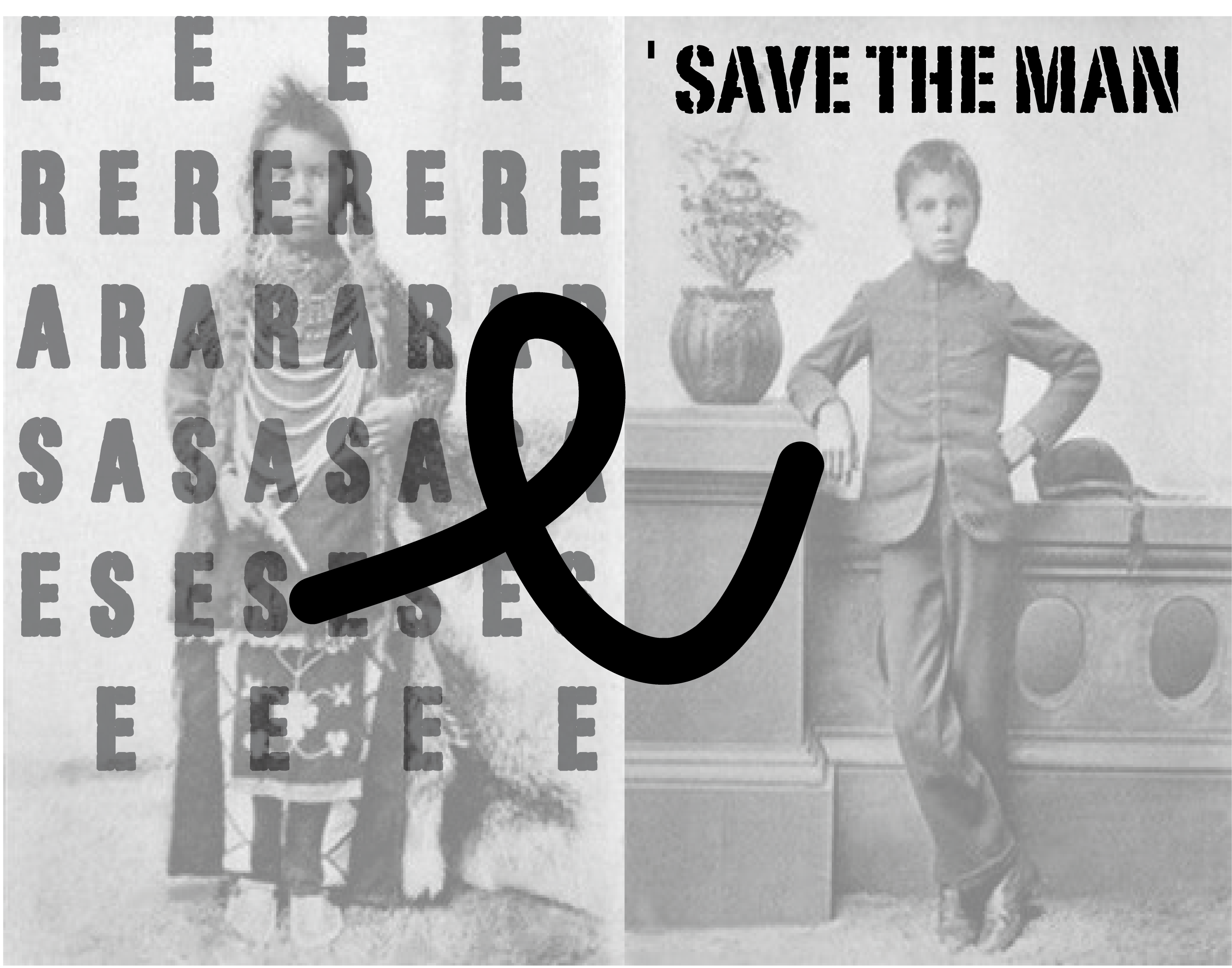 In this exhibition, Nielsen explores the impact and legacy of schooling in the US including the many ways formal education has participated in the violence of settler colonialism. Scholar Sandy Grande argues that both Indian Boarding Schools and other forms of US public education, were integral to the goals of subjugating Indigenous peoples, contributing to the colonization of Indigenous minds and bodies. Nielsen highlights this relationship between education and colonization with works like E is for Erase which features two photographs of a young boy named Thomas Moore Keesick from the Muscowpetung Saulteaux First Nation. This photographic pair shows Keesick upon admission to the Regina Indian Industrial School in 1897, and after school leaders forced him to remove the clothing and long hair that connected him to his community. Images like this portrait pair serve as heartbreaking reminders of the history that Nielsen explains was not taught to most US citizens, by their family or by the education system. As Grande asserts, indoctrination through education was a vital component of the theft of Indigenous land, resources and labor.