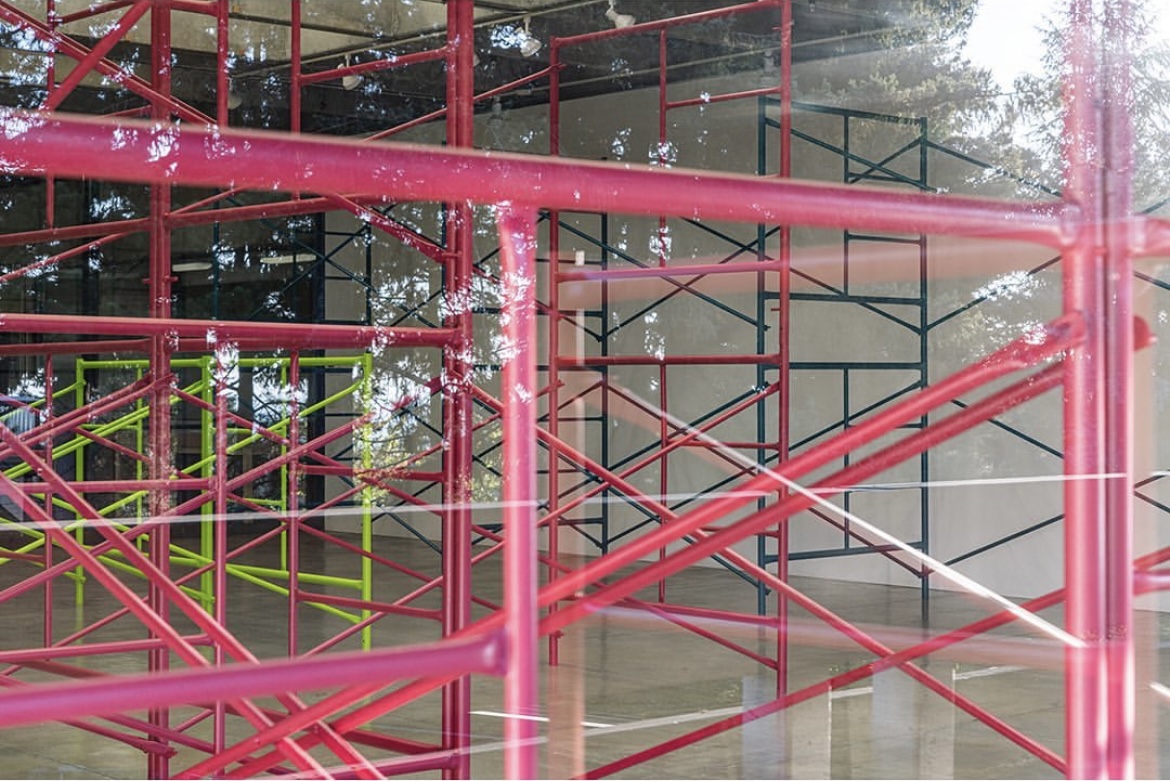 Avantika Bawa, Charged Voids, detail of pink and green scaffolds, site-specific installation in the North View Gallery, PCC Sylvania, 2022 (Photograph: Mario Gallucci)