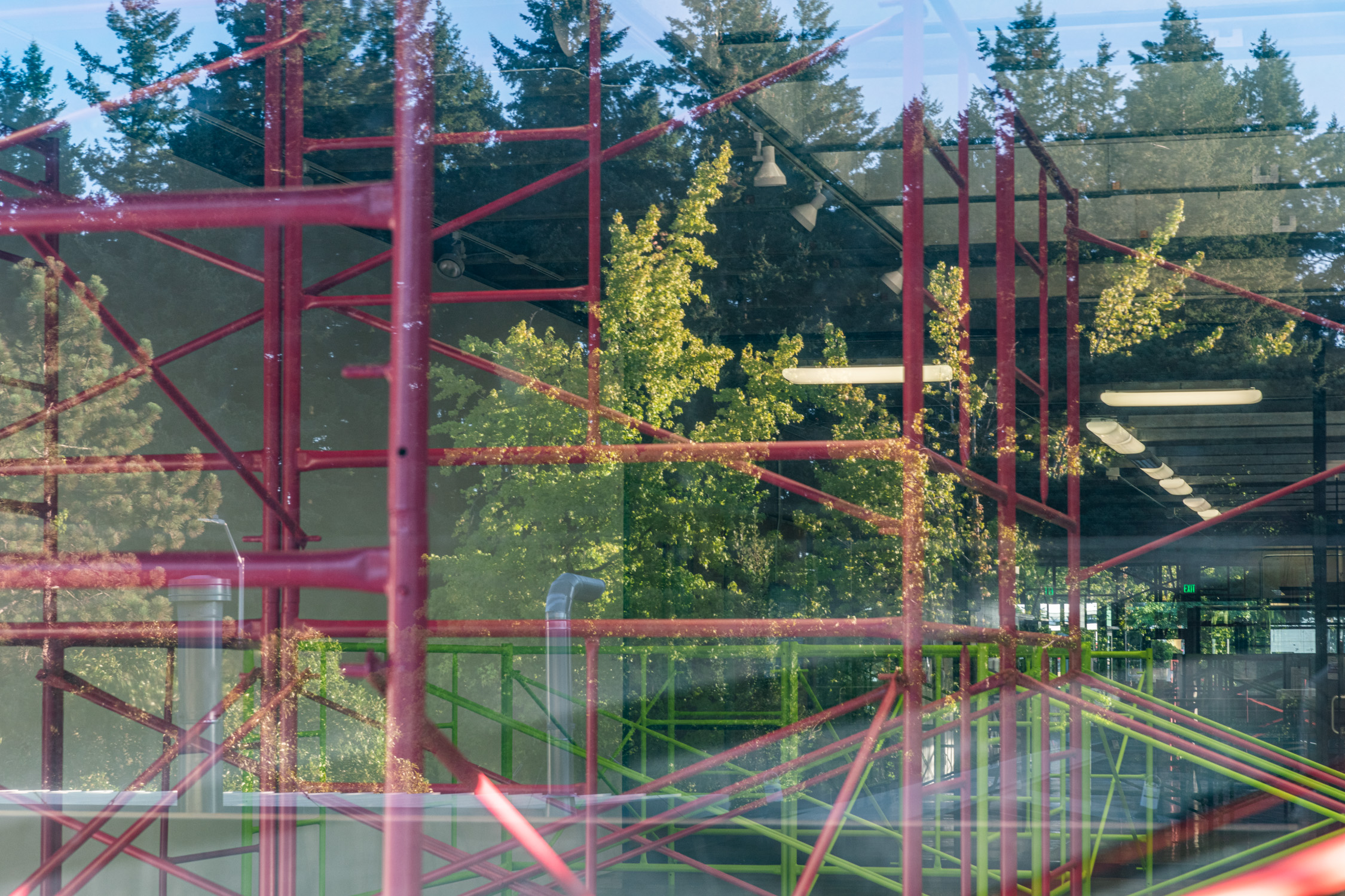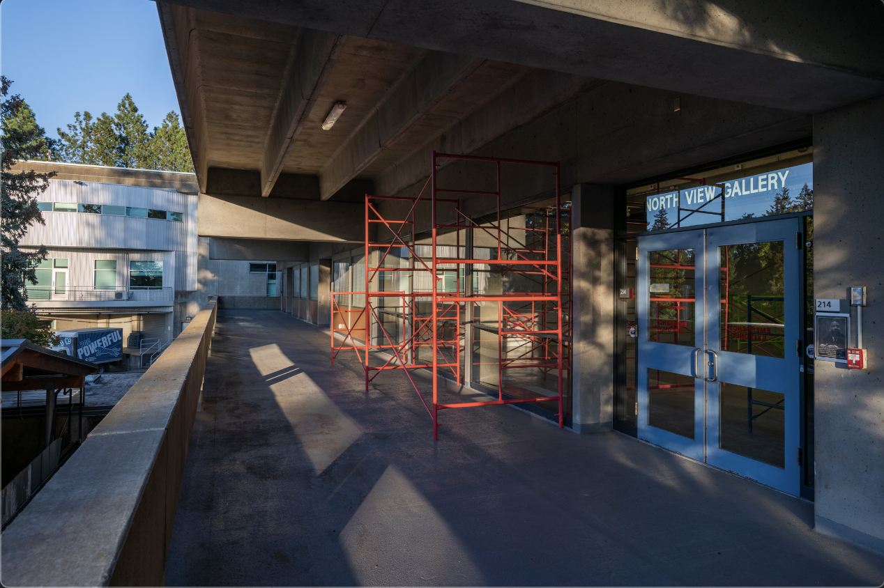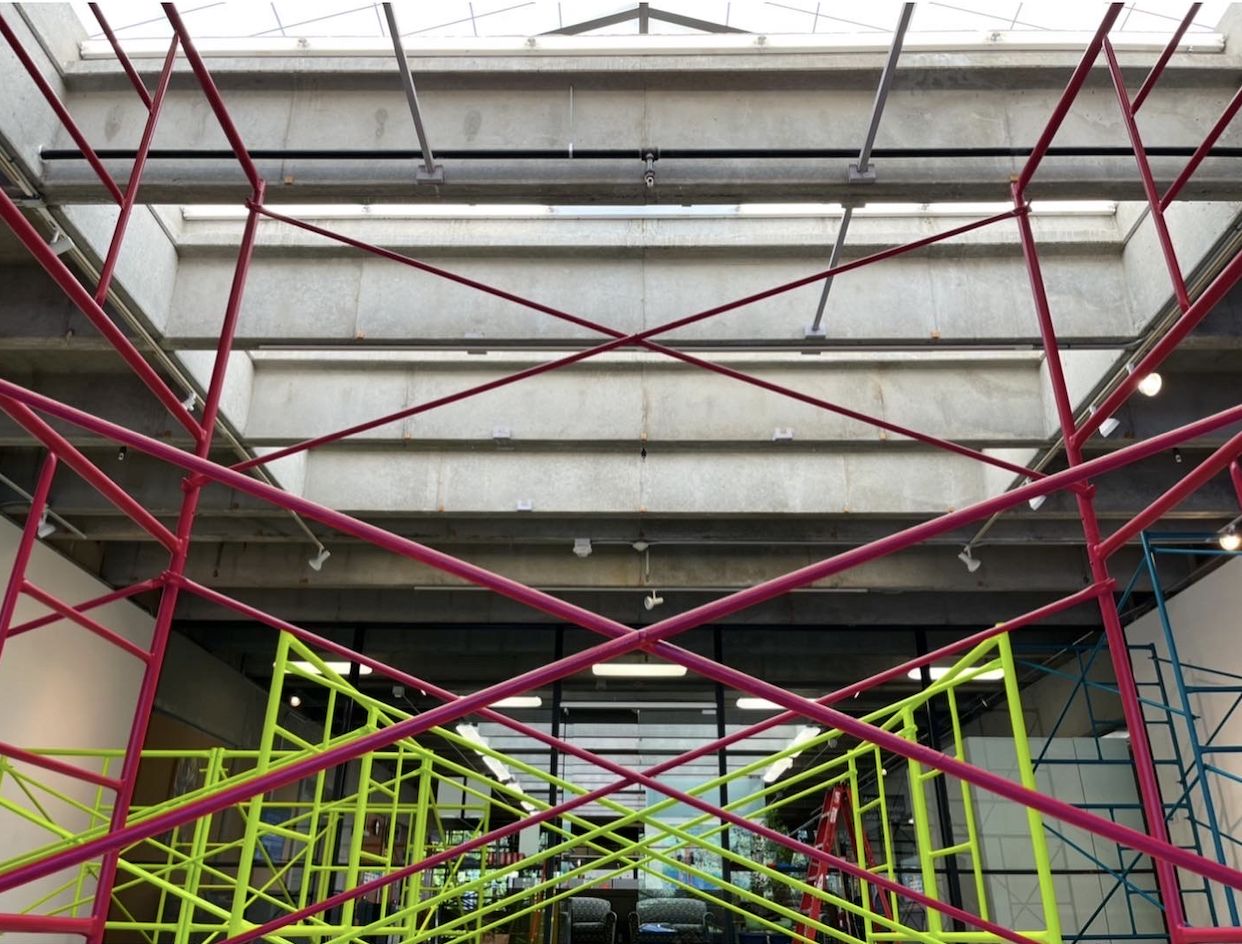 In their book, The Charged Void, the Smithsons wrote about their attempt ‘to drag a rough poetry out of the confused and powerful forces which are at work in a mass production society.’ This attempt resonates with the everyday poetry that Bawa exposes in the functional form of the scaffold, a form that allows humans to reach new heights, that makes back-breaking labor possible, and that can frame and reframe spaces. What kind of poetry happens when these functional objects occupy the charged voids of Brutalism? How do they help us see the college campus and the gallery with new eyes? How do the scaffolds draw our attention to the history of the campus and to the present renovations the campus is undergoing? What will the future of the PCC Sylvania campus look like, and where will its historic Brutalist buildings fit into that future? At a time when many people are returning to Portland Community College campuses for the first time since 2020, Bawa’s installation provides a scaffolding around which the college community can come together and engage in meaningful conversations about place and history.