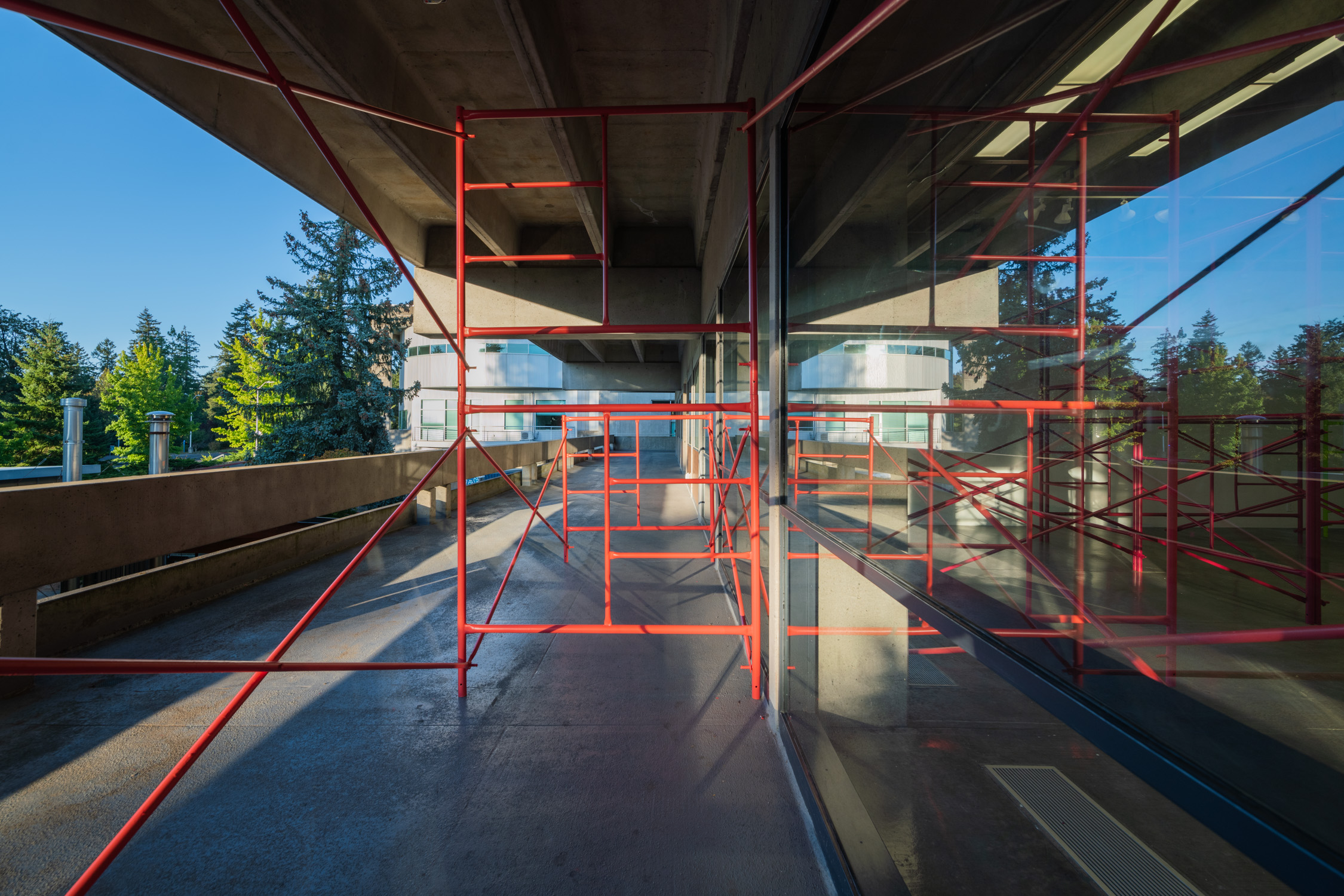 Brutalism’s simplified, modular shapes and raw concrete form the core of the Sylvania campus. Concrete walkways surround and connect the original Sylvania buildings functioning as the pedestrian and communal spaces described as “charged voids” by UK architects Alison and Peter Smithson. In fact, one of these concrete walkways borders the North View Gallery. Most classrooms in the early buildings were once visible through large windows from these exterior walkways (now many of the windows are frosted). In keeping with the principles of openness and transparency important to the first college president, Amo DeBernardis, floor to ceiling windows span both ends of the North View, allowing maximum visibility into the gallery. While the north facing windows reduce the barrier between interior and exterior, Avantika further dematerializes that boundary by placing a scaffold outside and painting the same salmon pink as a scaffold on the inside, near the emergency exit.