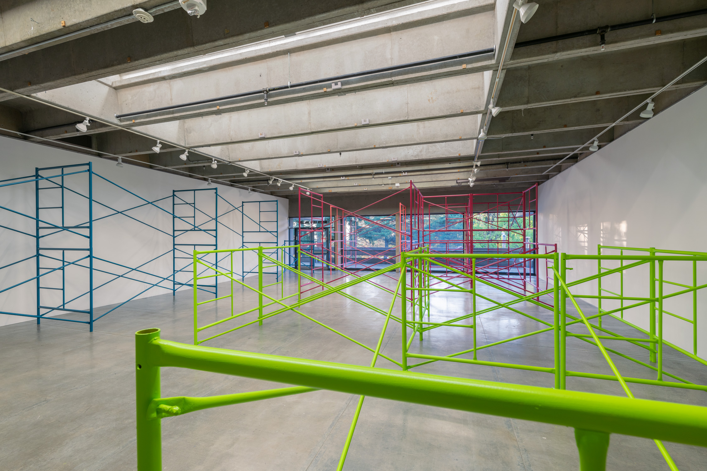 Avantika Bawa, Charged Voids, scaffolding of varying colors and dimensions, site-specific installation in the North View Gallery, PCC Sylvania, 2022 (Photograph: Mario Gallucci)