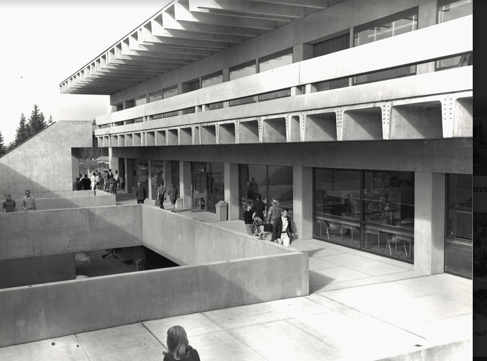 Brutalism, as a late modernist architectural style, also features abundant contradictions. The term took its name from the French béton brut, or raw concrete, demonstrating the honesty of buildings that don’t try to hide their materials or structure. Brutalism too was a hopeful, utopian style. Architects like the Smithsons designed buildings to address human social and communal needs, yet many decry Brutalist buildings as cold and impersonal, giving new meaning to the word brut. Brutalism began as a functional solution to rebuilding Europe after the devastation of World War II, but what is the role of brutalist buildings today in the context of the climate crisis? What is the role of Brutalist buildings described as alienating, at a time when human relationships and connection to our surroundings feel more important than ever? How can the thinkers, artists, and workers at Portland Community College create spaces of belonging on a campus that feels designed to confuse and disconnect?