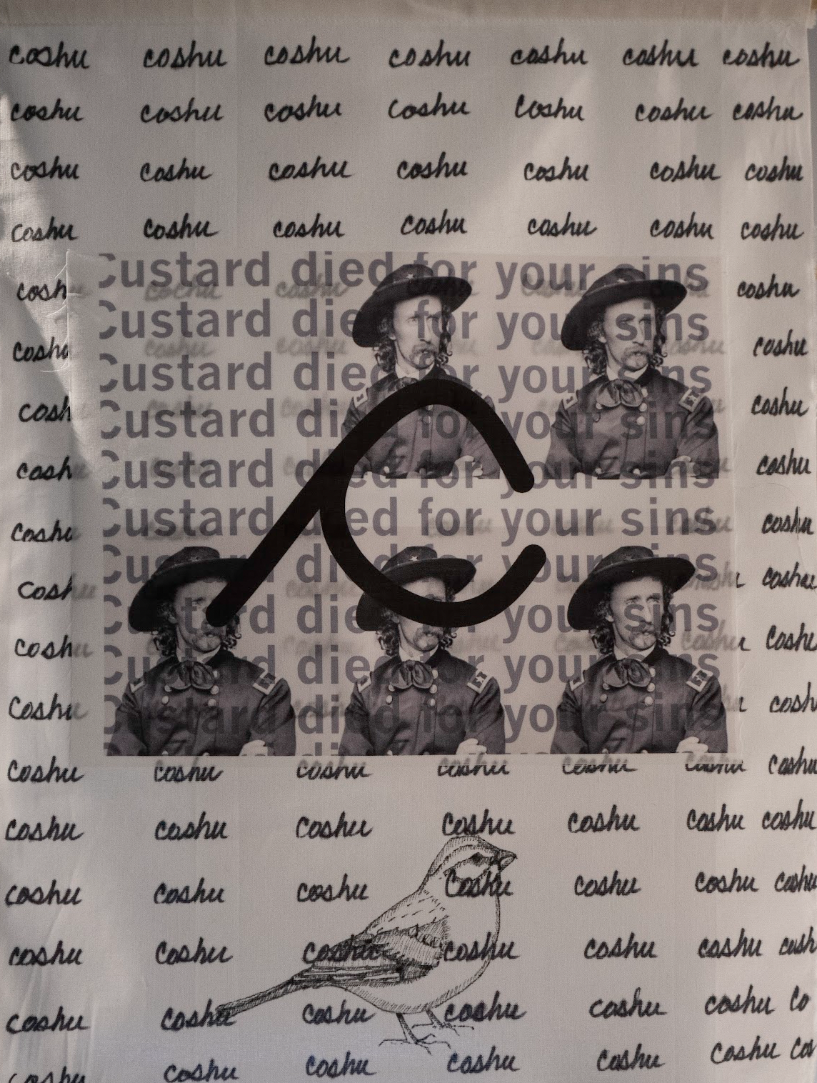 This flag references a significant book from the Red Power Movement. Custer Died for Your Sins, written in 1969 by Vine Deloria Jr. (Standing Rock Sioux). The book is a collection of essays that call for Indigenous sovereignty, rejecting political and social assimilation. Throughout the book, Deloria is critical of aid organizations, including churches, which Deloria argues do more harm than good. He is also critical of disciplines like anthropology, ultimately causing anthropologists to reconsider their approach to working with Indigenous communities. Finally, Deloria explores the importance of Indian humor in the book, and Nielsen leans into that humor on this flag by referring to US Army Officer General George Custer as Custard, a European dessert or pastry filling. Custer was central to brutal treaty violations, specifically the US campaign to steal the Black Hills from the Lakota Sioux. Deloria’s book explains Custer’s violent treatment of Indigenous people and argues that US citizens should examine what they have learned about Western Expansion and Indigenous Treaties, challenging us all to acknowledge the brutality of US history.