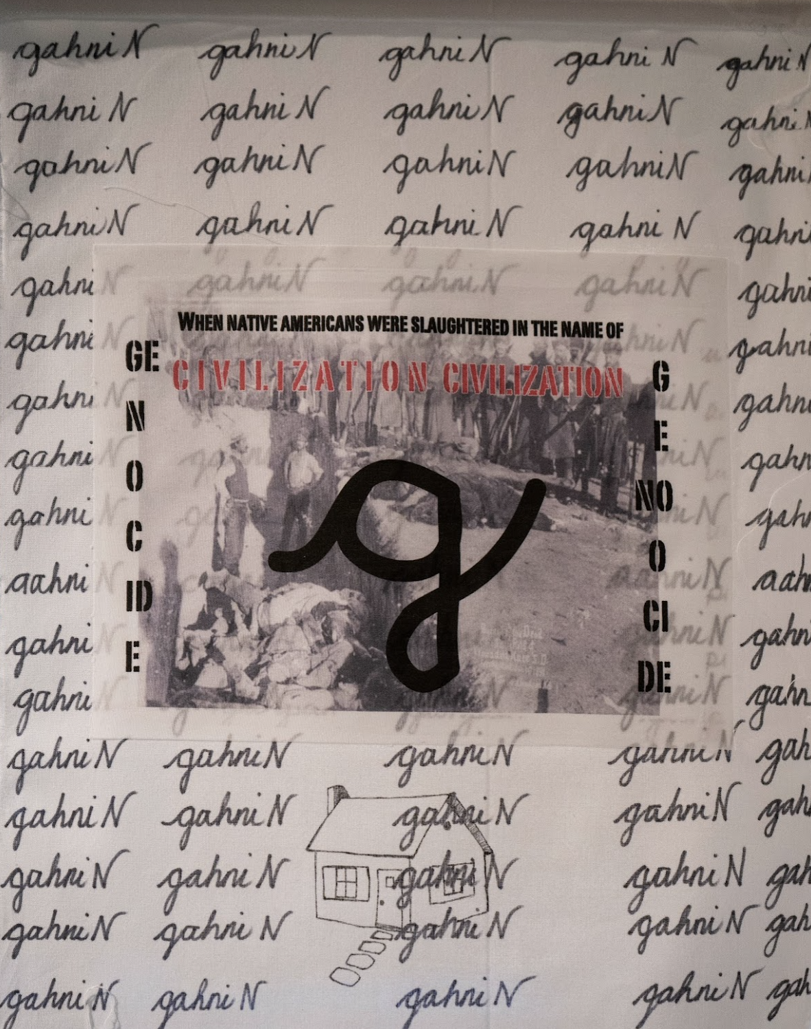 Rochelle Kulei Nielsen, “G is for Genocide” digital print and drawing on cloth, 2021. Photograph: Jordan VanSise.