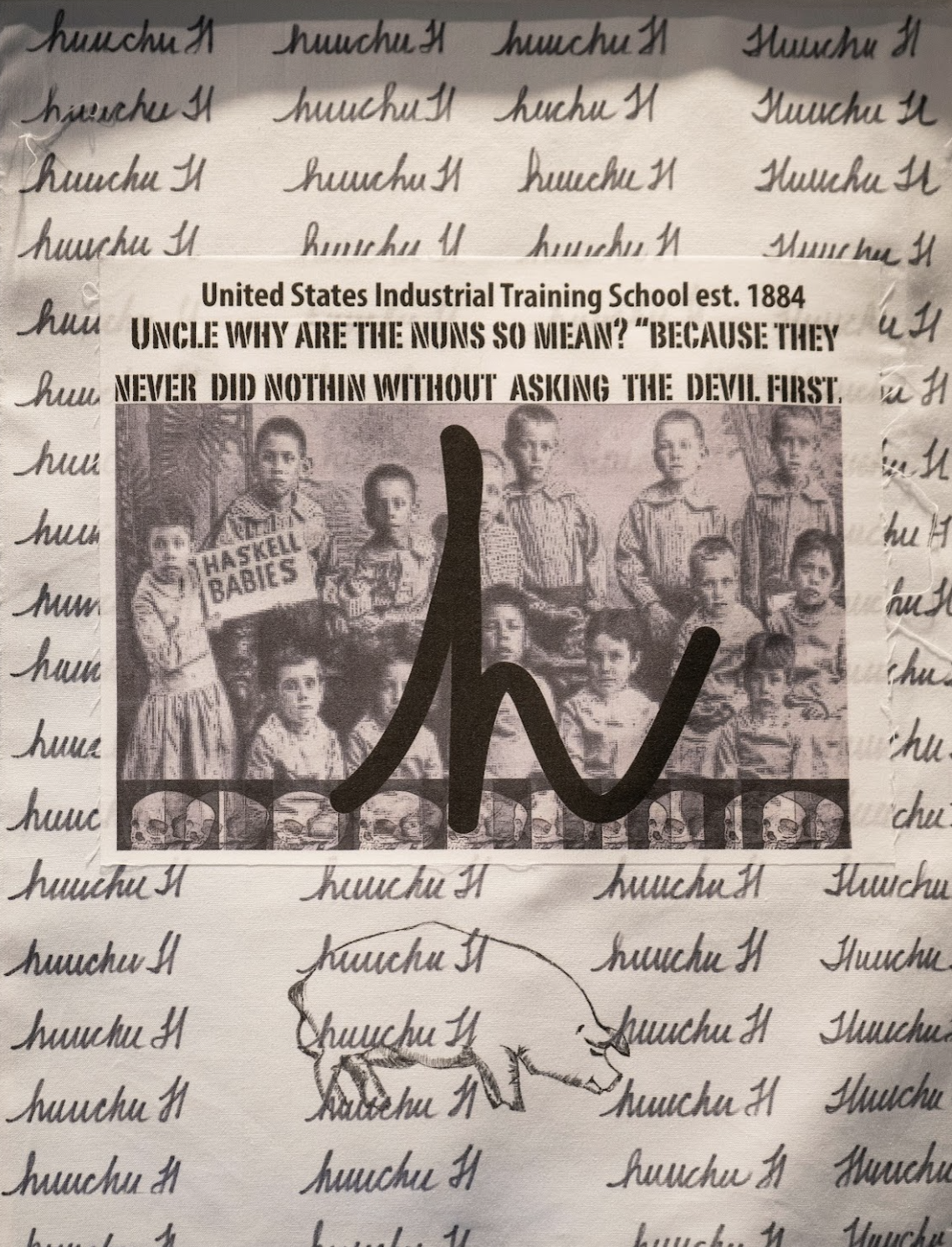 Rochelle Kulei Nielsen, “H is for Haskell Babies” digital print and drawing on cloth, 2021. Photograph: Jordan VanSise.This flag features a photograph of a group of Native American children at the Haskell Institute, taken between 1884 and 1889. The Haskell Institute was an Indian Boarding School established in Lawrence, Kansas in 1884. The boarding school was traumatic for Native children and their families. Students were required to stay at Haskell for four years without contact with family and tribes, to sever the connection to tribal traditions and customs. During the early years, the school was run like the military, requiring students to wear uniforms and march everywhere.