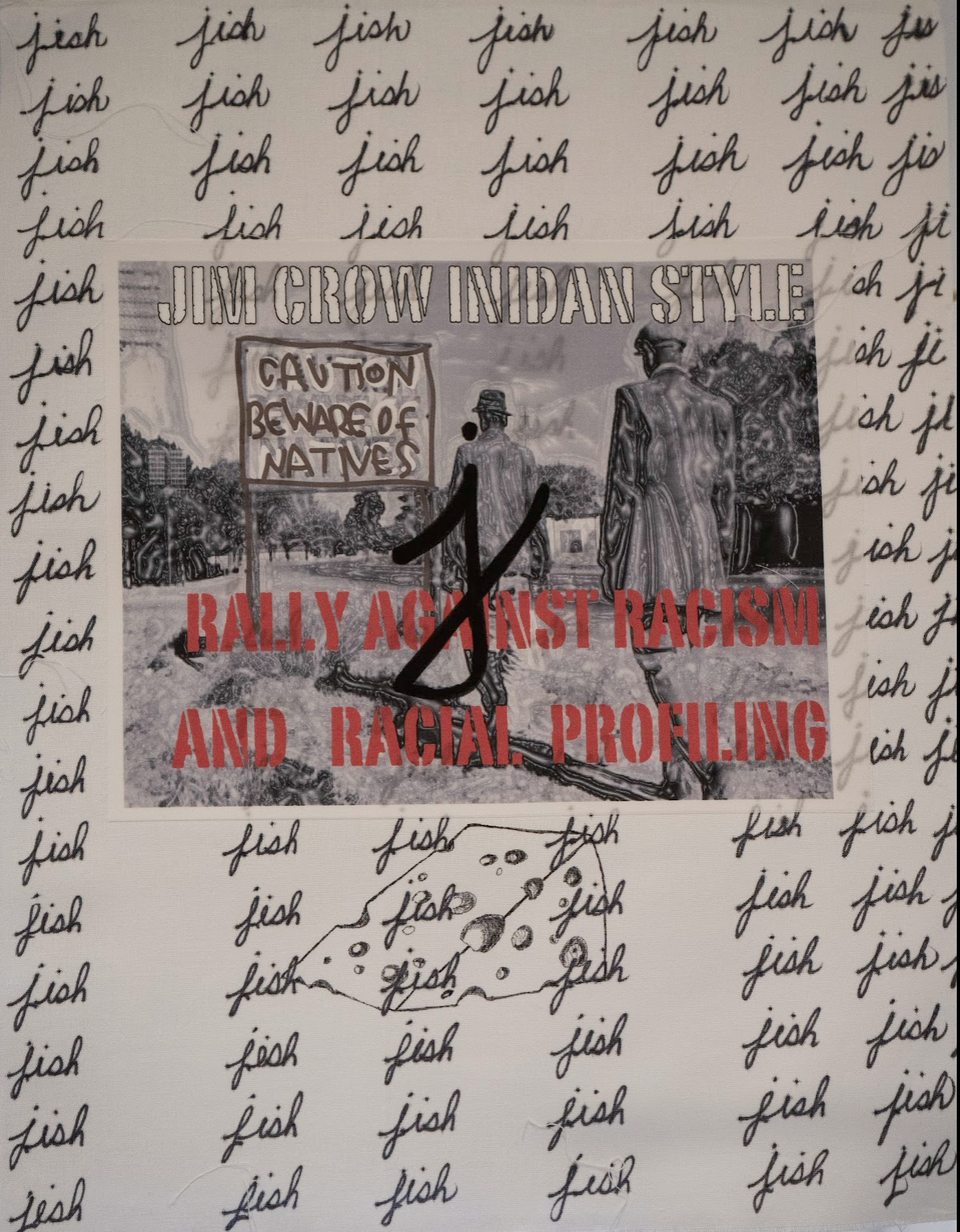 Rochelle Kulei Nielsen, “J is for Jim Crow Indian Style” digital print and drawing on cloth, 2021. Photograph: Jordan VanSise.