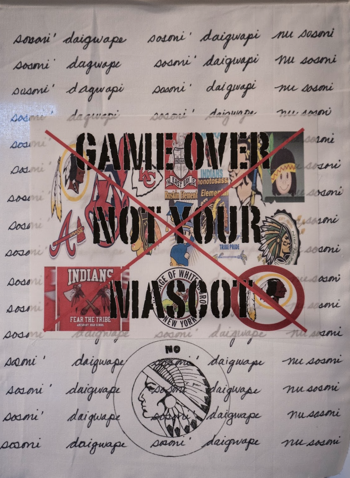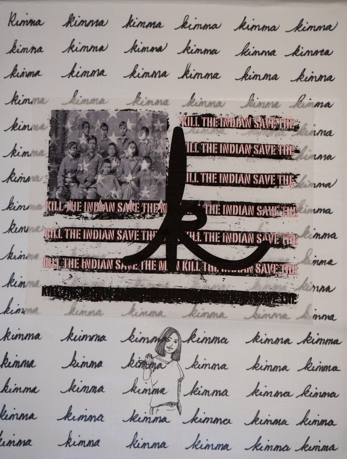 Rochelle Kulei Nielsen, “K is for Kill the Indian” digital print and drawing on cloth, 2021. Photograph: Jordan VanSise.