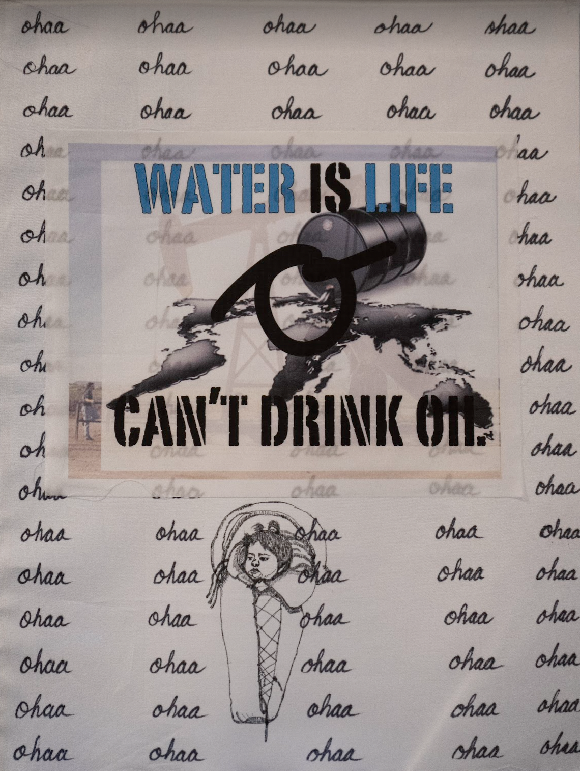 Rochelle Kulei Nielsen, “N is for No DAPL” digital print and drawing on cloth, 2021. Photograph: Jordan VanSise.