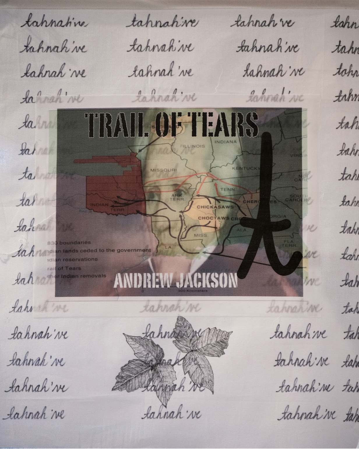 Rochelle Kulei Nielsen, “T is for Trail of Tears” digital print and drawing on cloth, 2021. Photograph: Jordan VanSise.