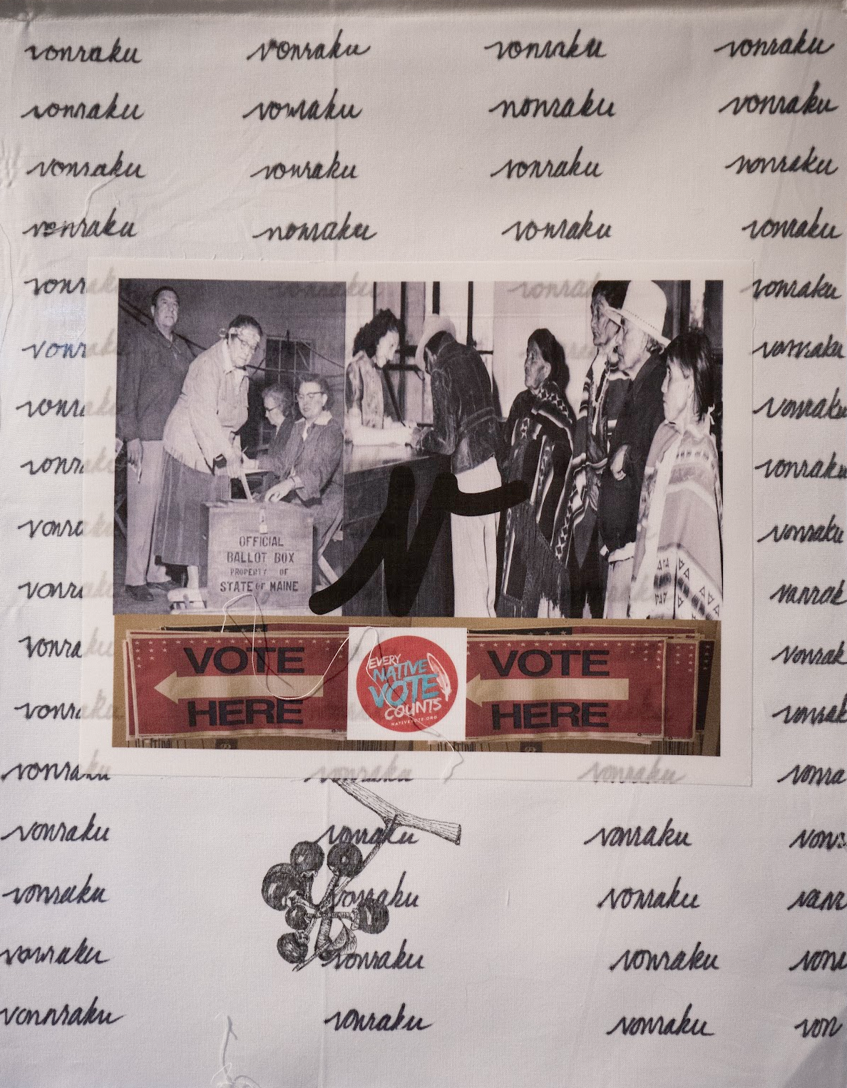 Rochelle Kulei Nielsen, “V is for Voting” digital print and drawing on cloth, 2021. Photograph: Jordan VanSise.