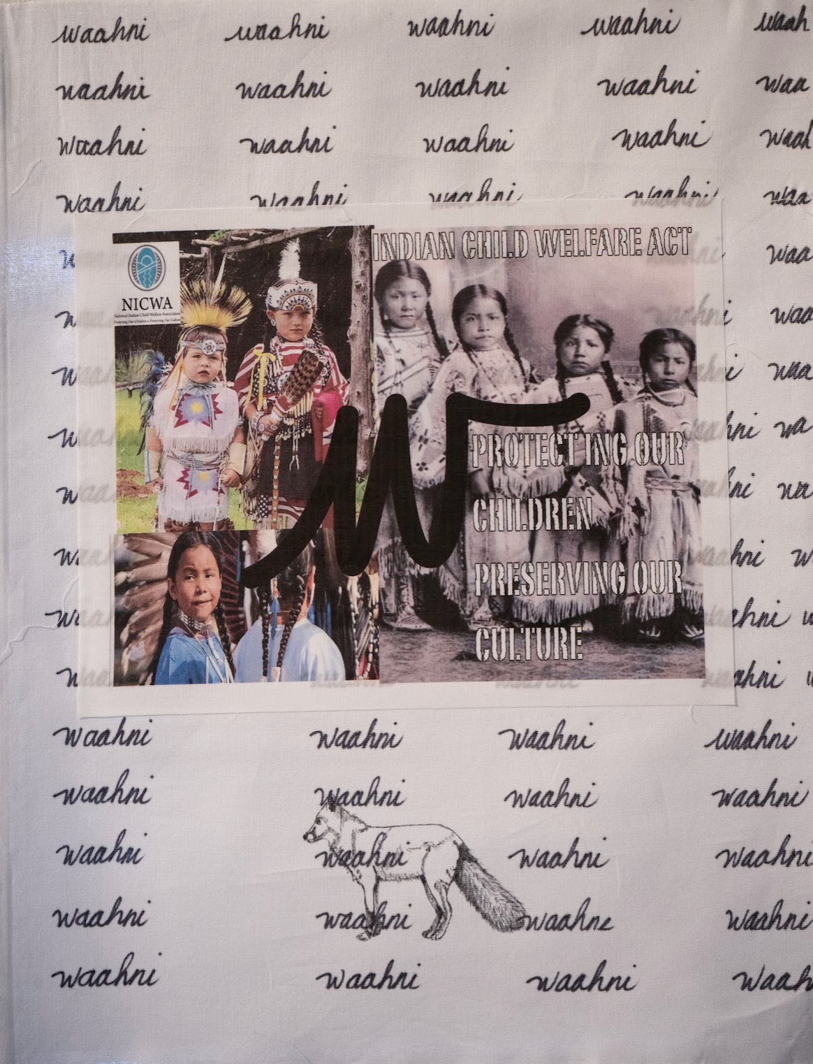 Rochelle Kulei Nielsen, “W is for the Indian Child Welfare Act” digital print and drawing on cloth, 2021. Photograph: Jordan VanSise.