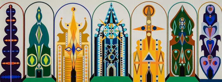 Anna Fidler, 7 Spirit Houses, Gouache and Flasche of paper, 192″ x 72″, 2022
