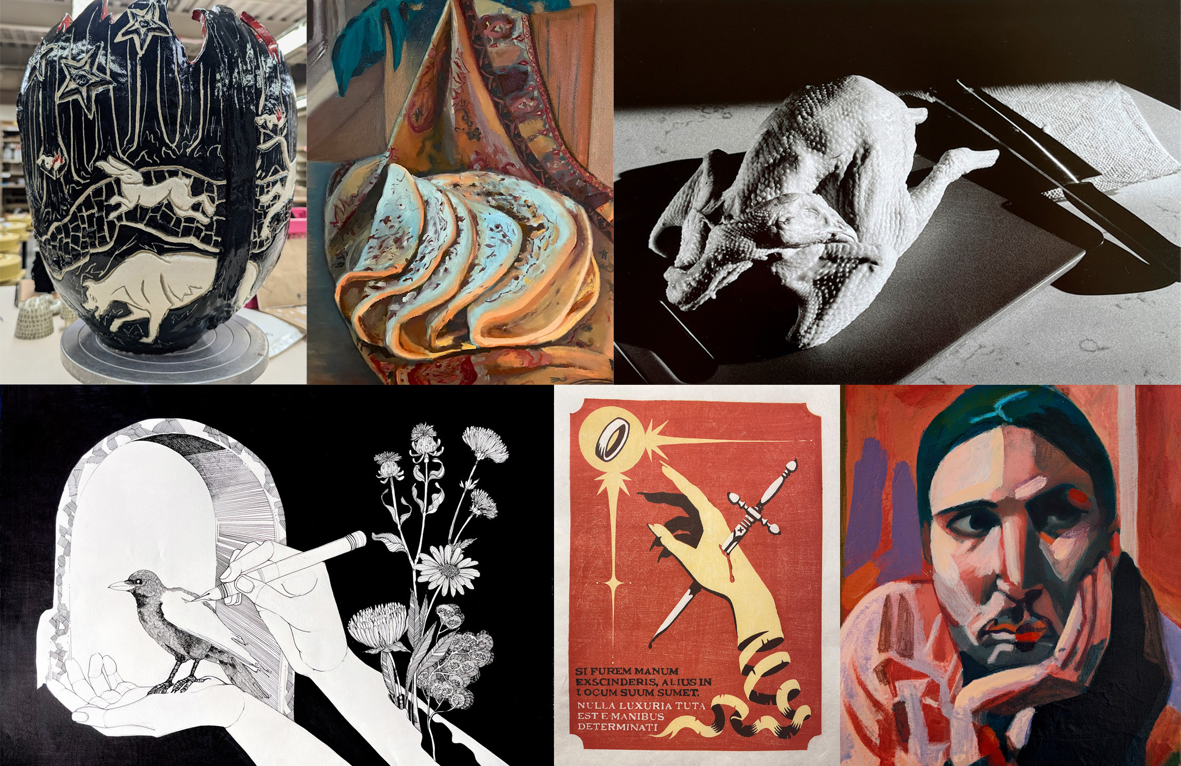 Collaged image of various artworks (from left to right, starting from the top row): Roots Would Suffice, She Guessed, Shay Harpoon, ceramic, 20″x12″x12″, 2025 Naan, Nuzhat Hossain, oil on canvas, 18×24″, 2024 Chicken Going to Heaven, Thu Nguyen, silver gelatin print, 8×11″, 2025 Into the World (Piece II, Diptych: The Journey), Claudia Sanchez, drawing, 18×24″, 2024 Determinati, Everett True, mokuhanga print, 9.5×12.5″, 2025 Repose, Mindy Mullins, acrylic on canvas, 8×8″, 2025