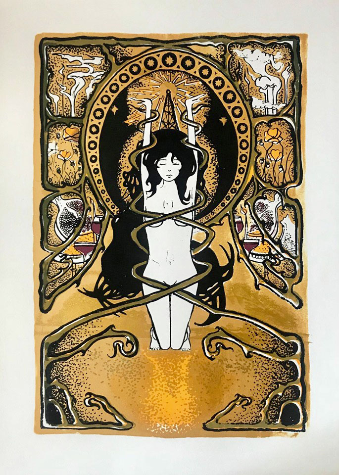 The first in a pair of prints embodying the philosophical concerns of freedom. The Inner Worm desires to submit to authority and the expectations of others in exchange for the promise of security and pleasure. In this vulnerable trust, she represents the base desires and the alleviation of existential anxiety offered by giving away one's freedom.