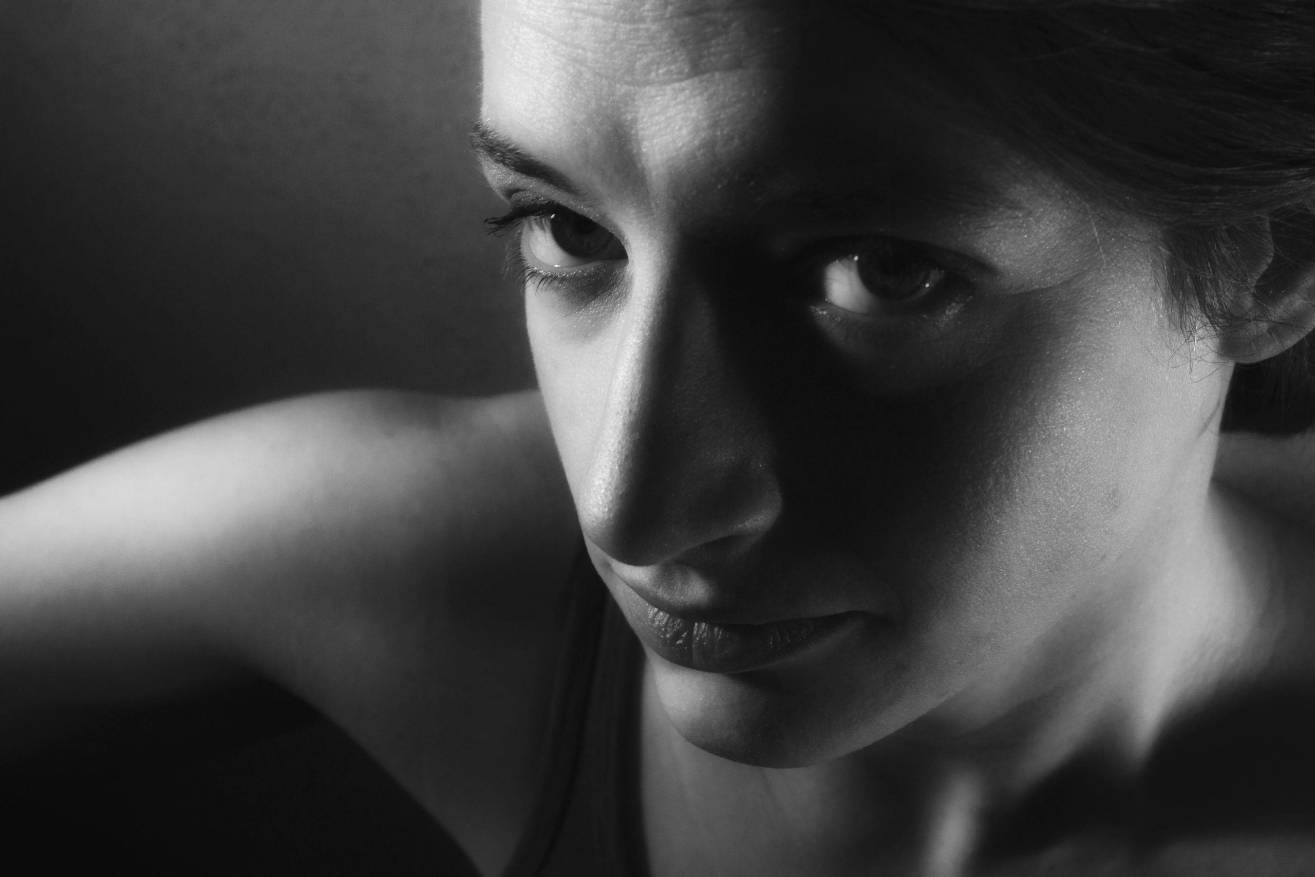 This photo plays with the concept of strength in vulnerability. By looking down on the model, she appears small and childlike but the dramatic shadows on her face convey a sense of fierce strength.