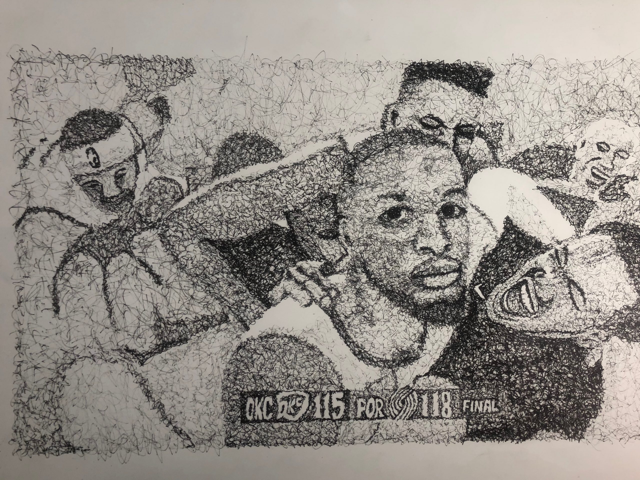 German Amaya, Damian Lillard’s The Shot, 2020, pigma micron black archival ink on Strathmore drawing paper, 18″ x 24″